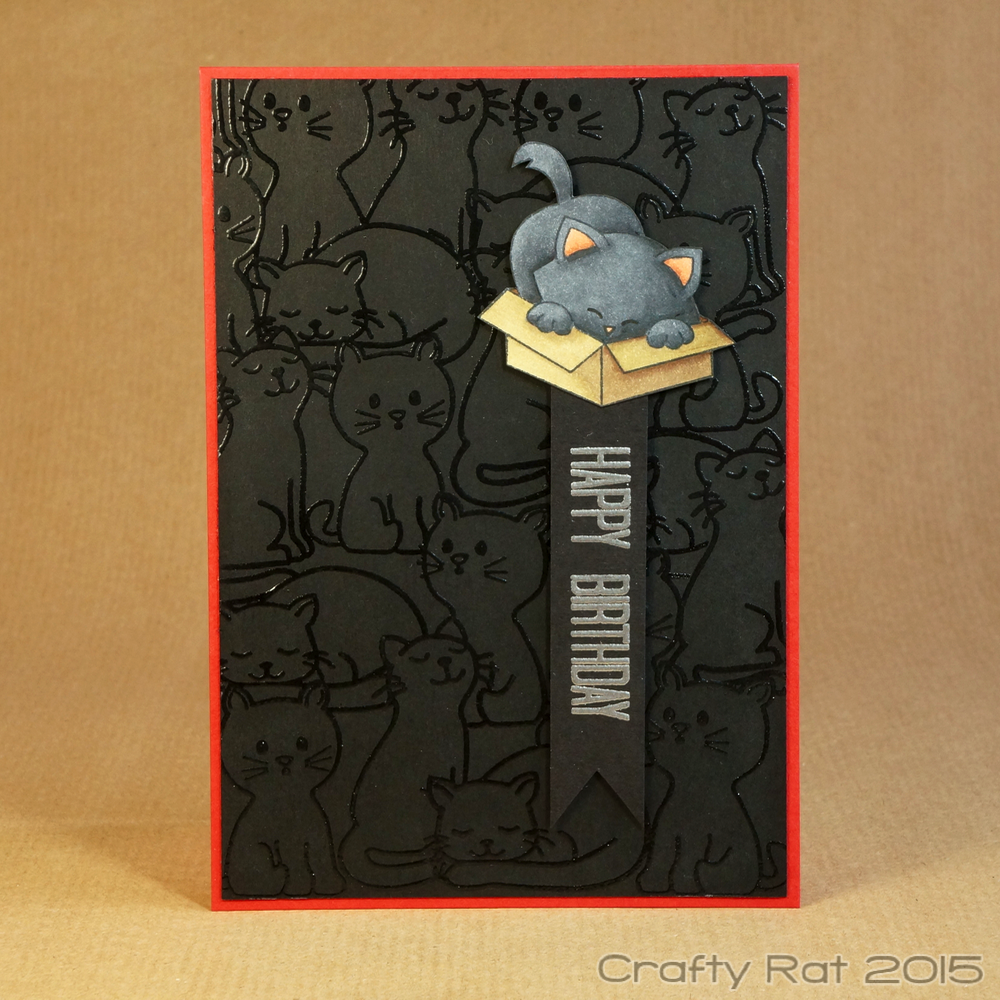 I coloured the main cat with Copics and fussy cut it out. The sentiment was stamped on a spare bit of black card, heat embossed in silver and then trimmed into a banner shape.