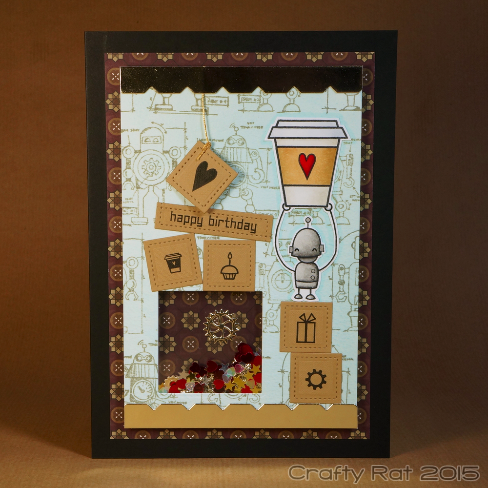 It’s that time of year when I have to come up with an idea for a birthday card for my other half. It had to have a shaker element, as he has liked the ones I’ve done so far (and didn’t want to give away the first one I did). He likes sci-fi and bad movies, so robots were an obvious choice. And then there’s the daily coffee so… robot bearing coffee!