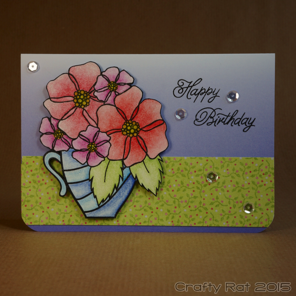 After much faffing about I finally decided to fussy cut it out and mount it over a strip of patterned paper on a gradient coloured card base. The sentiment was stamped and a few sequins added, and the bottom corners were rounded for a finishing touch.