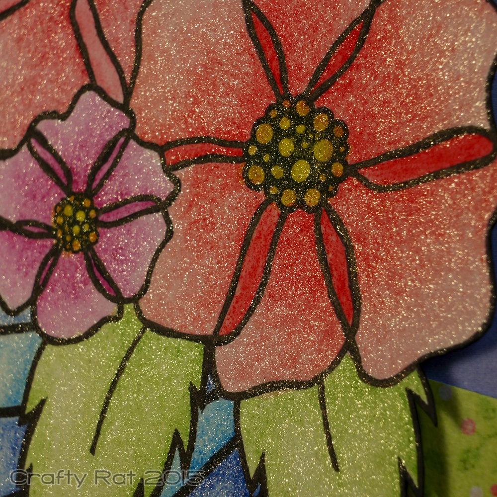 A lot of fussy cutting and arranging of masks to finalise the layout of the flowers, followed by much stamping and masking on watercolour paper. The flowers and cup were coloured with Inktense pencils blended with Wink of Stella. I went over the flower outlines with fineliner to intensify them a little.