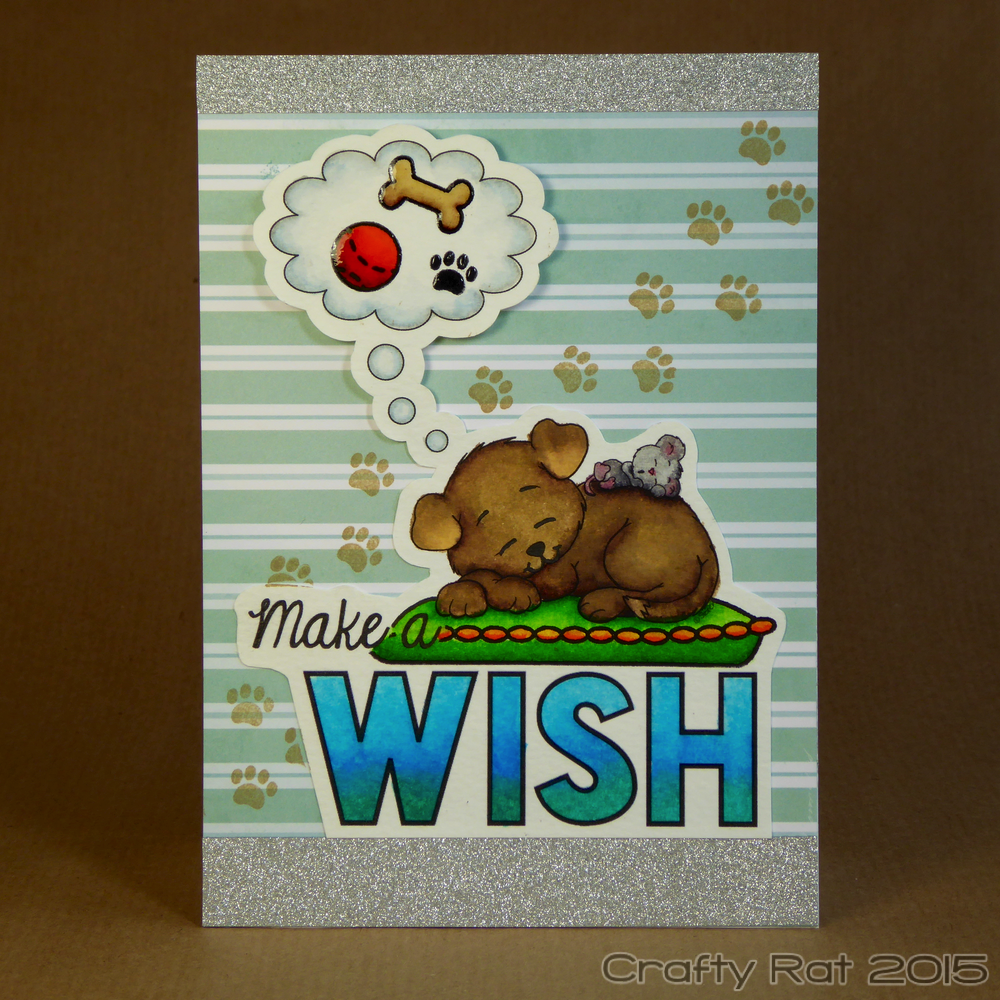 My original idea was to turn this into a Christmas card and have the puppy snoozing in front of a Christmas tree, but as I was browsing through my digi stamps I spotted this “make a wish” digi, which was a freebie with Simply Cards & Papercraft magazine a while ago.