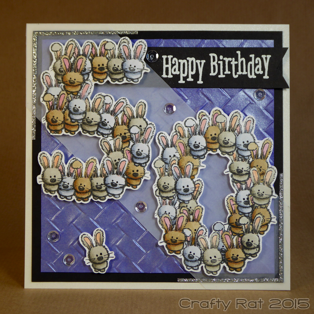 A fiftieth birthday card for someone who loves bunnies. What better to do than make a card with fifty bunnies on it in the shape of the numbers five and zero.