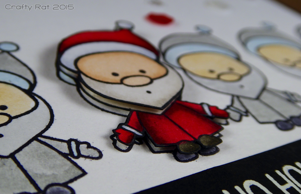 The main Santa was stamped on Copic-safe card and coloured. I used a gel pen to emphasise the eyes and mouth and then I promptly stuck my thumb in it and smeared the ink over Santa’s face. Once I’d stopped cursing myself, I figured out a way to rescue it. I hate completely remaking things so I stamped another Santa and just coloured his head. I fussy cut out the head and the original Santa and layered the clean face over the smudged one with some thin foam tape. I used the same foam tape to pop up the whole Santa on top of one of the grey Santas.