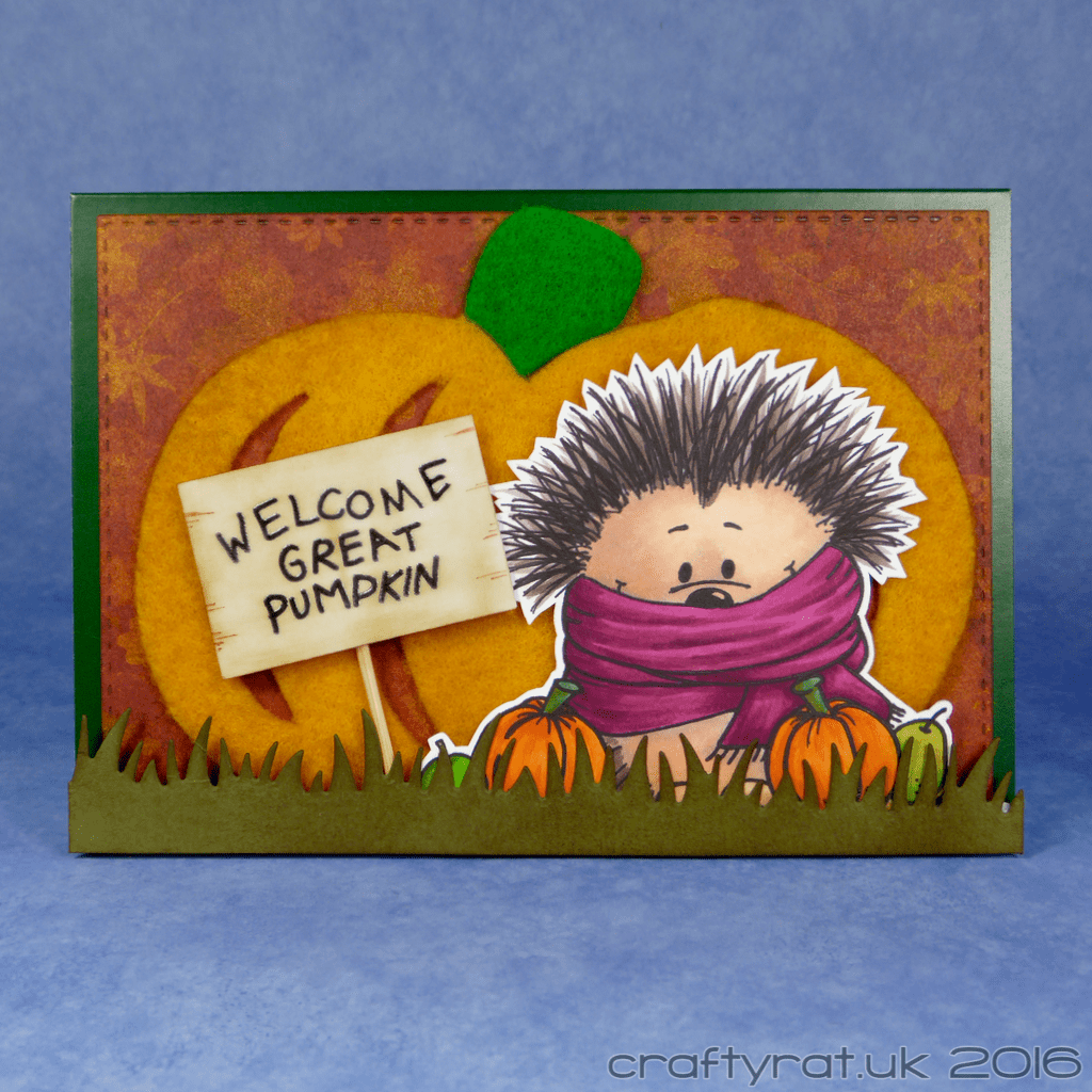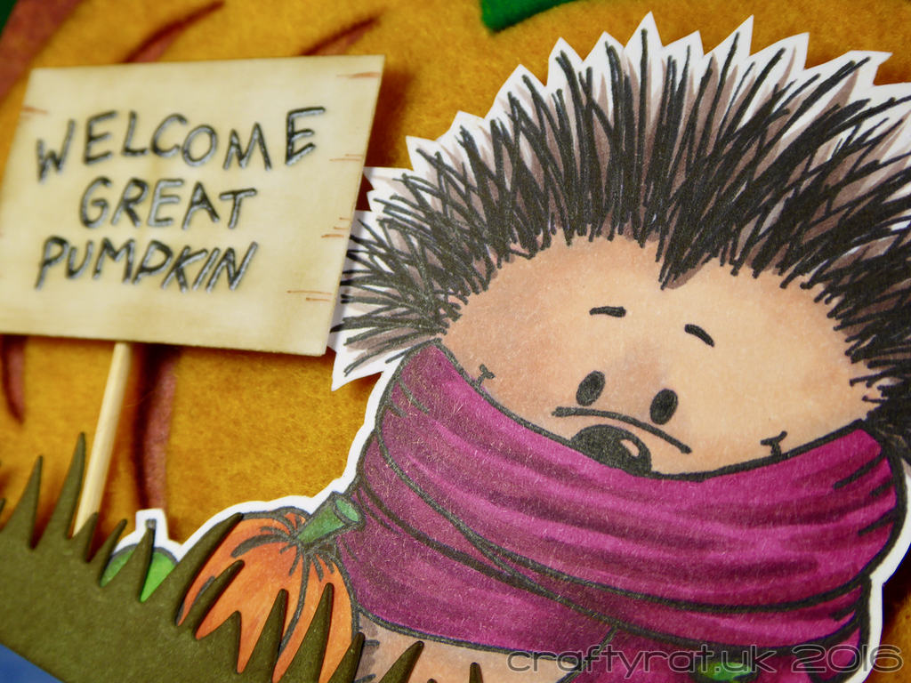 This cute hedgehog wrapped up warm in his chunky scarf is the image for October’s progressive challenge from Gerda Steiner Designs. I have to give credit to my other half for coming up with the great pumpkin idea; I love how it turned out.
