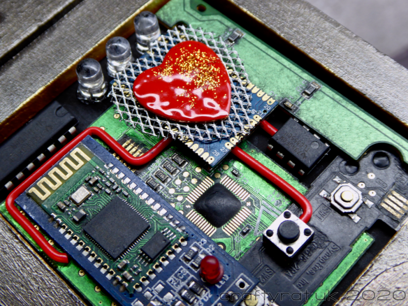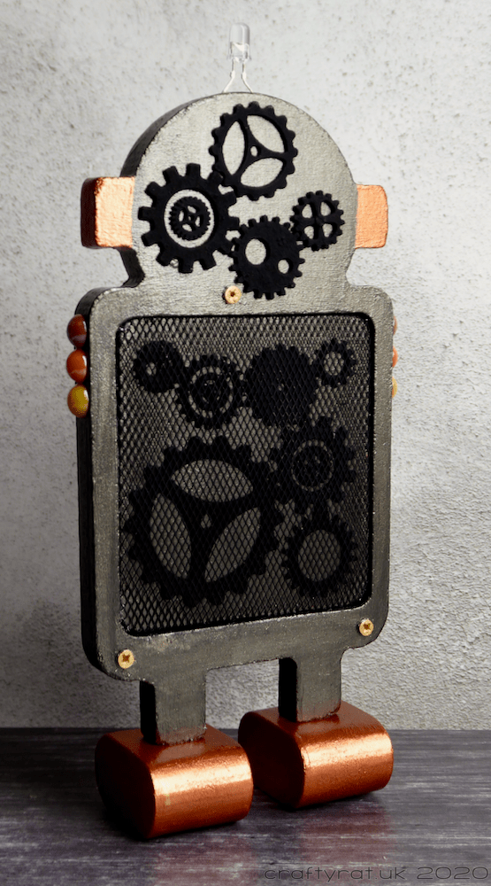 Then it was just a case of assembling it all. I did glaze over the central panel of components, just to tone down the bright green of the boards. There were a couple of small holes in the top of the robot’s head so I glued the legs of an LED in them using glossy accents. And I covered up the holes on the shoulders with domed embellishments.