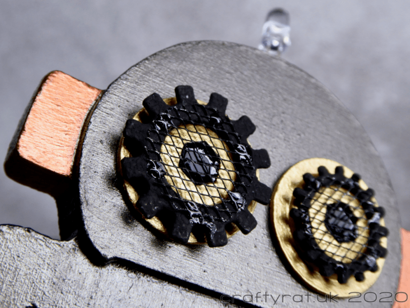 The cogs were painted in the super-matte black 3.0, and the eyes were done using the metallic gold. The mesh was brushed over with black gesso.