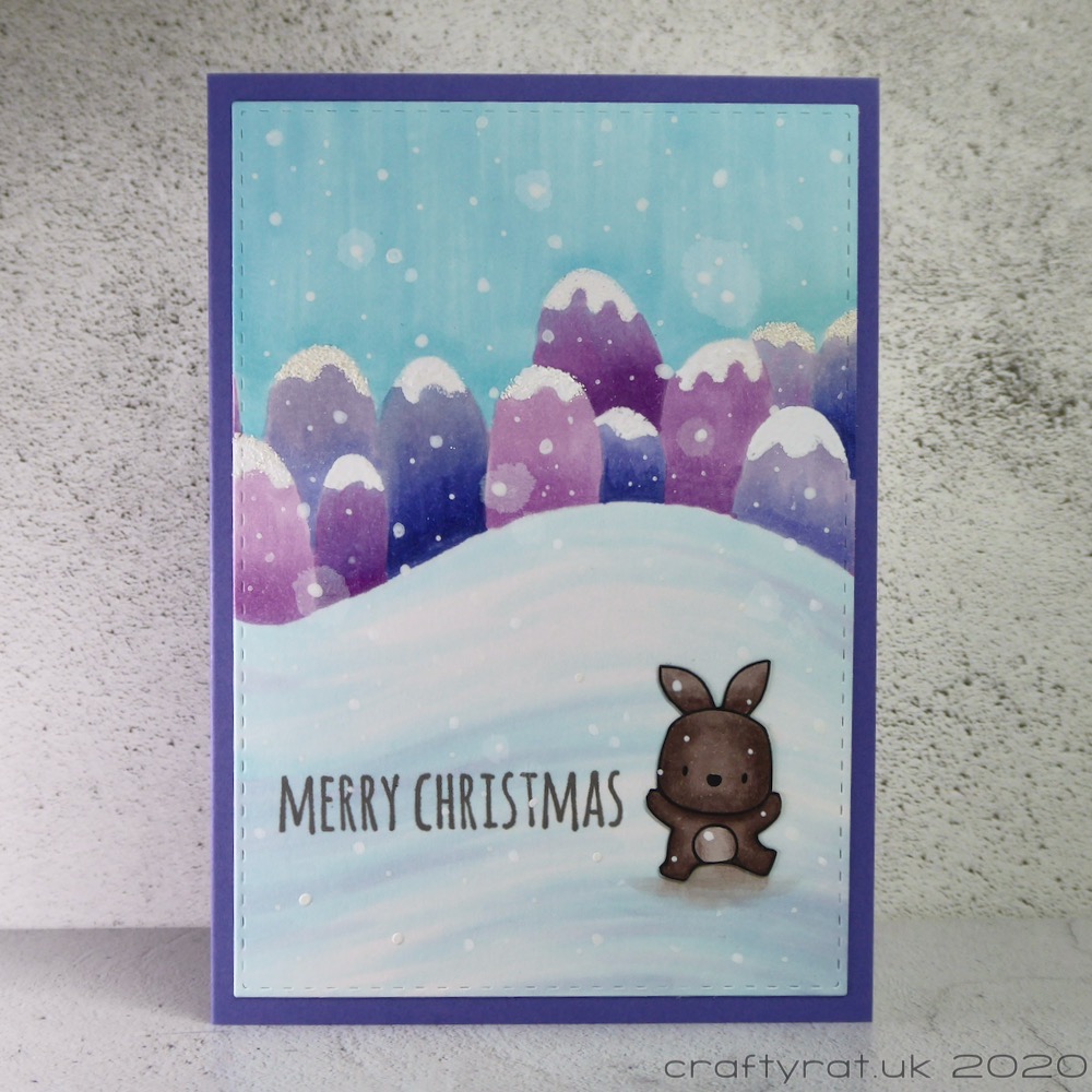 Christmas card with a small bunny sitting on the snow in front of a row of stylised purple hills.