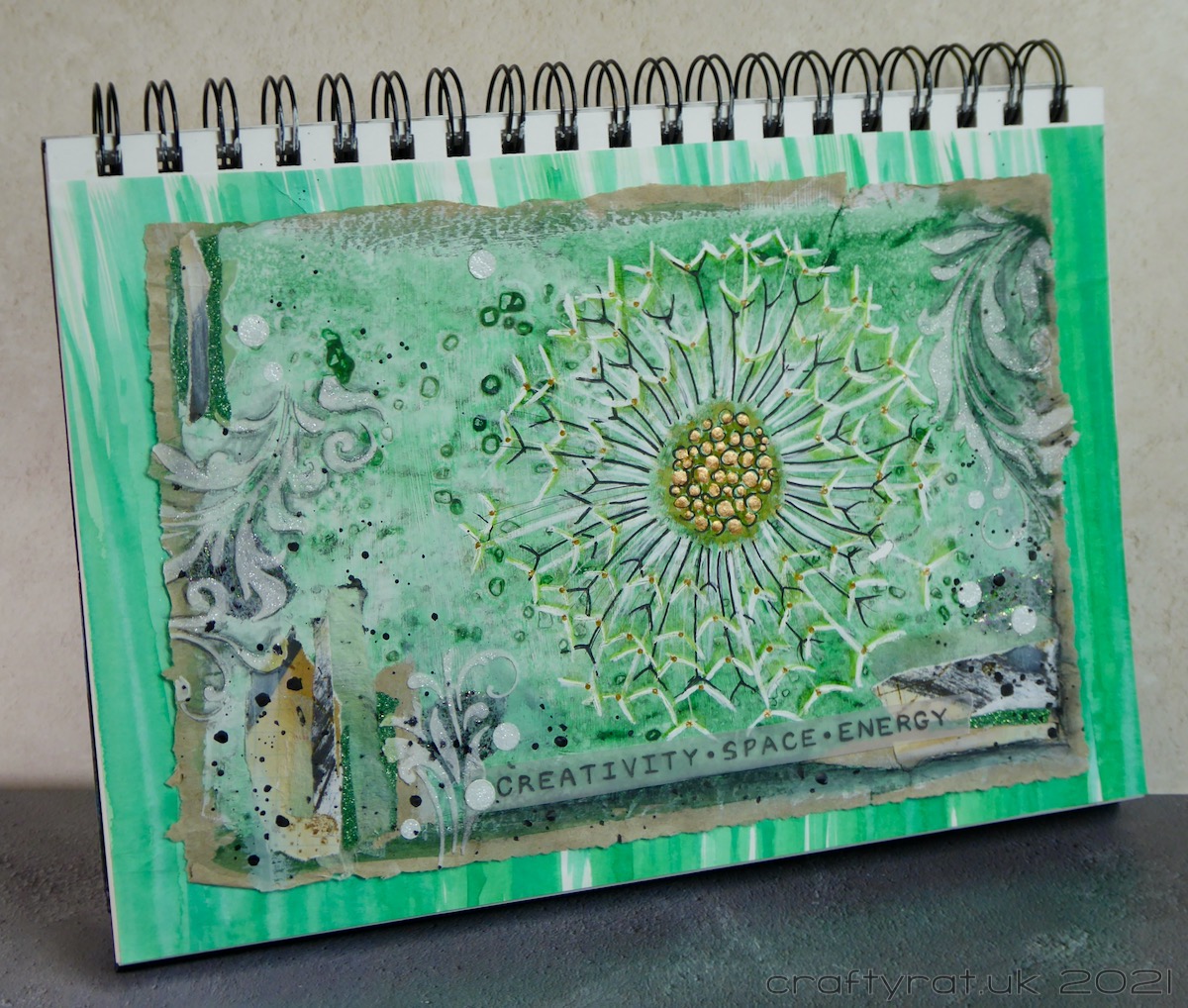 A predominately green art journal page with a dandelion seed head surrounded by collage, stencilled texture paste and a banner reading "creativity - space - energy".