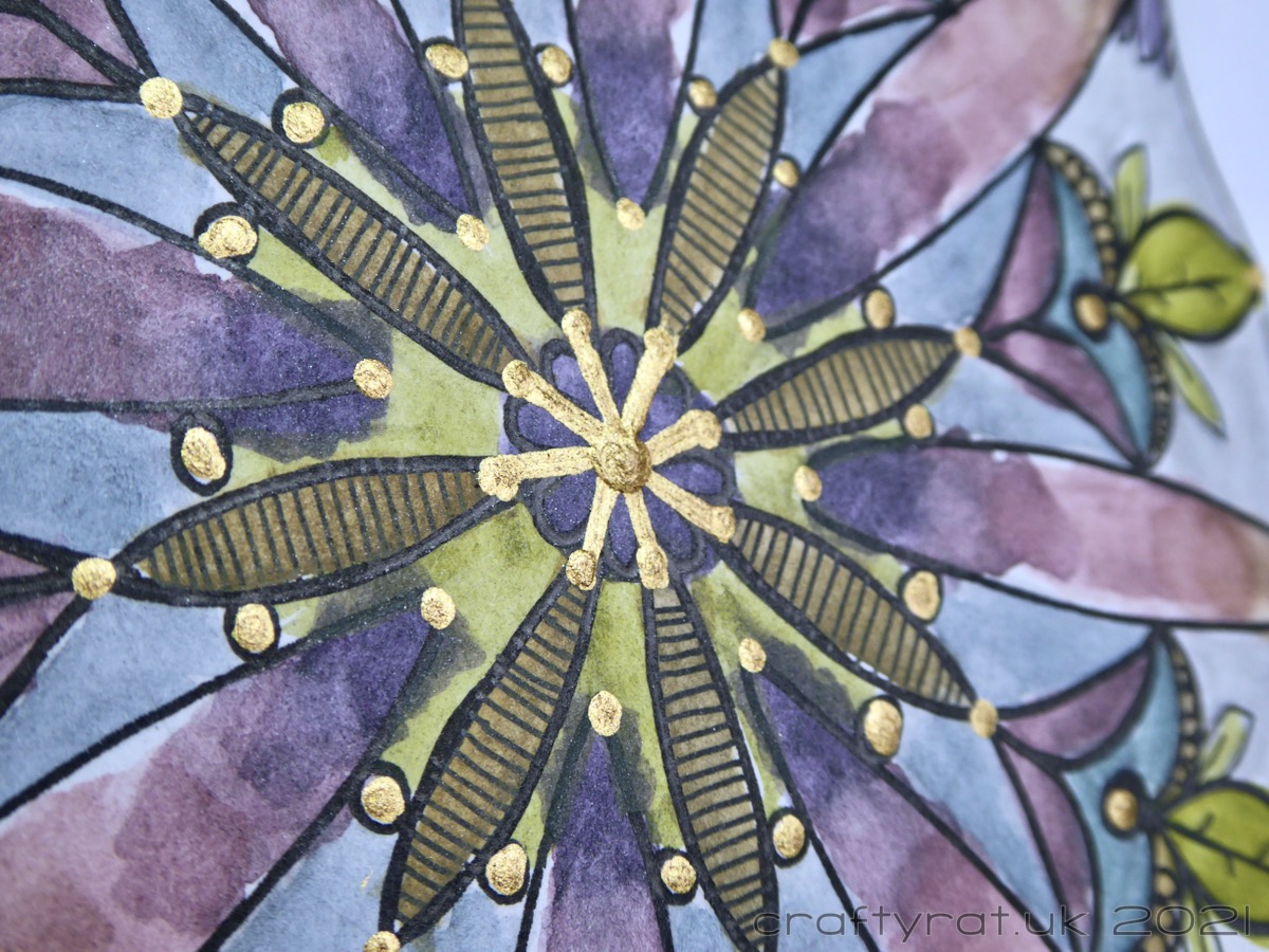 The previous mandalas I’ve made have been quite precise, with all the colouring done carefully inside the lines. The aim with this one was to be much looser and relaxed, to the extent that the initial long petal shapes were painted before the outlines were drawn. It goes against my instincts to colour outside the lines but I have to admit I do rather like the overall effect.