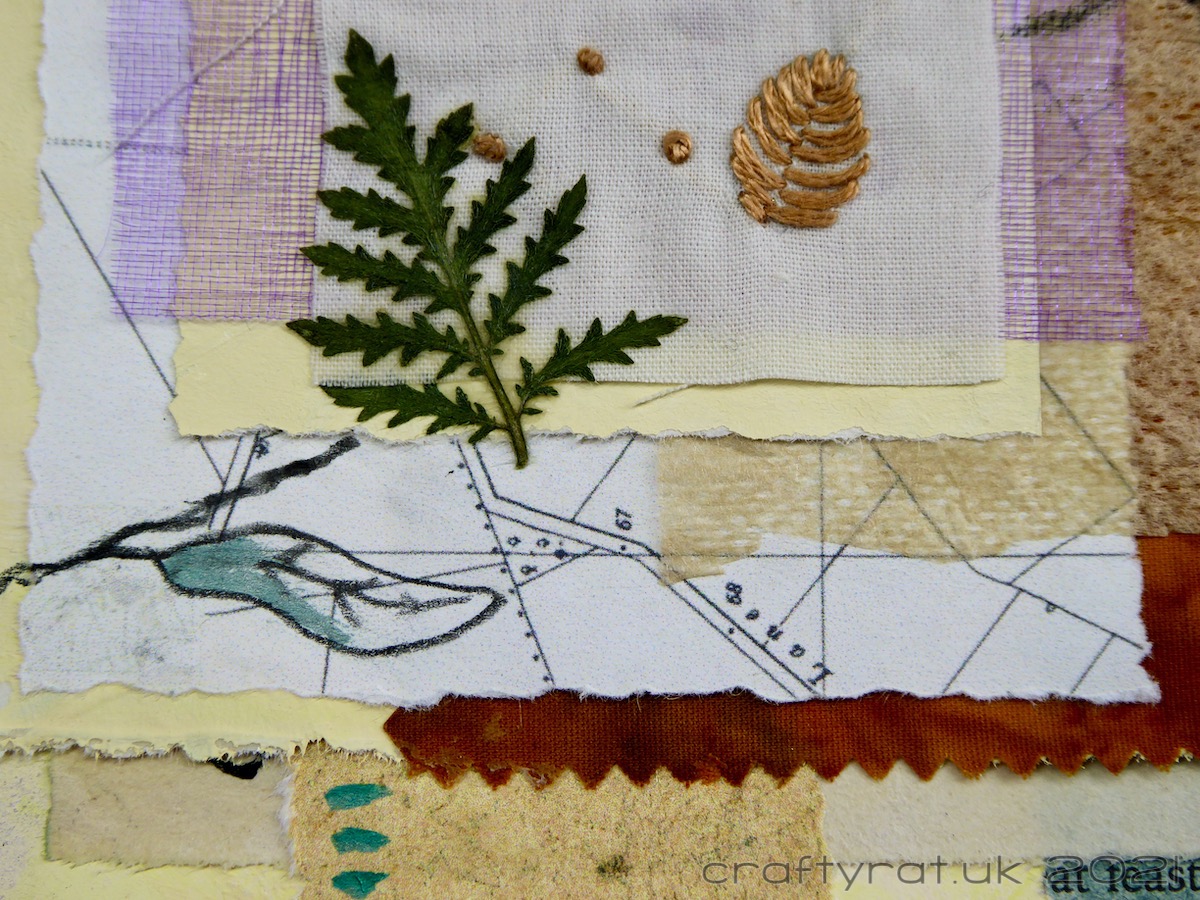 Some people chose to fix their papers to the page so that they could all still be seen. I decided to glue them down in their stack. This was a deliberate choice. The thoughts on the note served their purpose as they were being written and everything else is there to help create the finished page, there is no need to put each individual piece under a spotlight. And it’s good practise to commit to using the things I’ve collected — it’s too easy to fall into the trap of keeping things because I’ve only got one of them or they’re too nice to use; they stop being art supplies at that point…