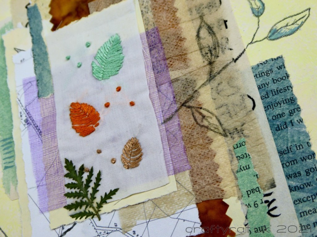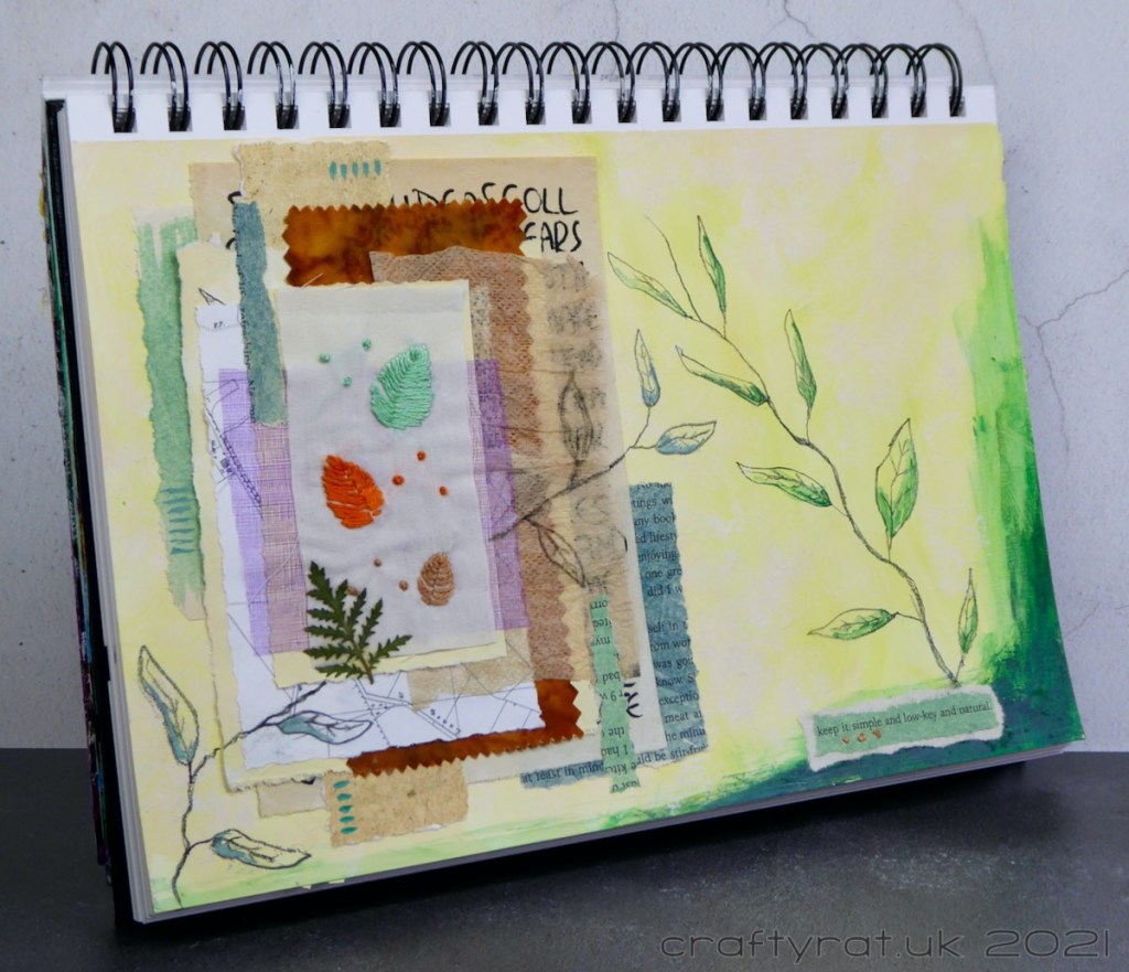 This lesson is a kind of homage to all those collected elements. A stack of papers and fabrics — including handwritten notes and embroidery — held in place on a soft painted background by loosely sketched leaves. I grew up in the countryside and nature is the one theme that I always return to.