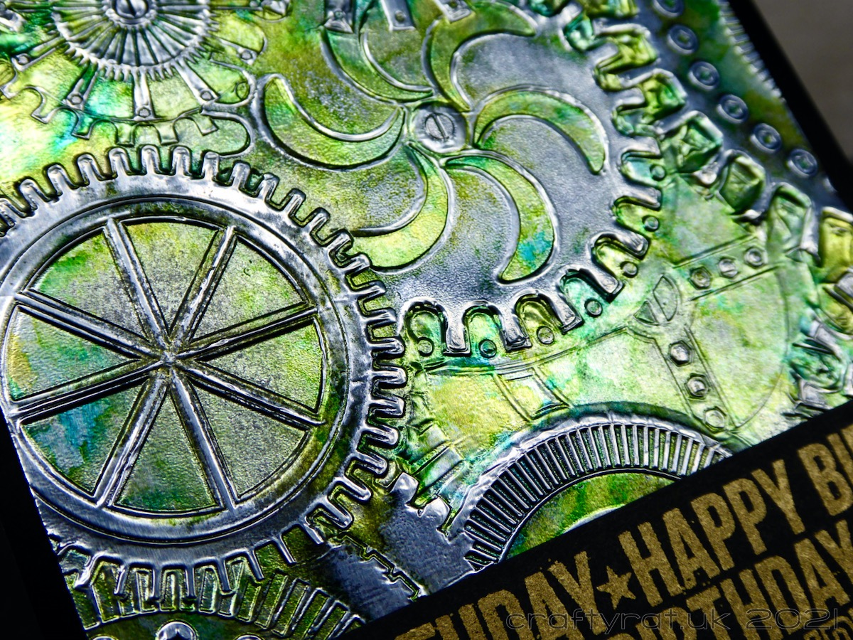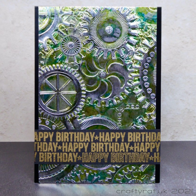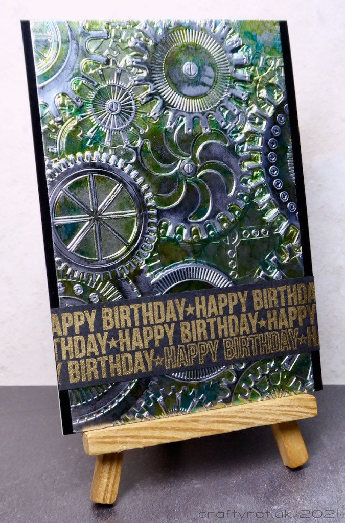 That started a chain of thought that ended up with me covering a piece of card with aluminium tape, colouring it with alcohol inks, and running it through a suitably masculine embossing folder. I rubbed a black archival ink pad over it to add some depth to the edges and then buffed it back to give a more subtle effect.