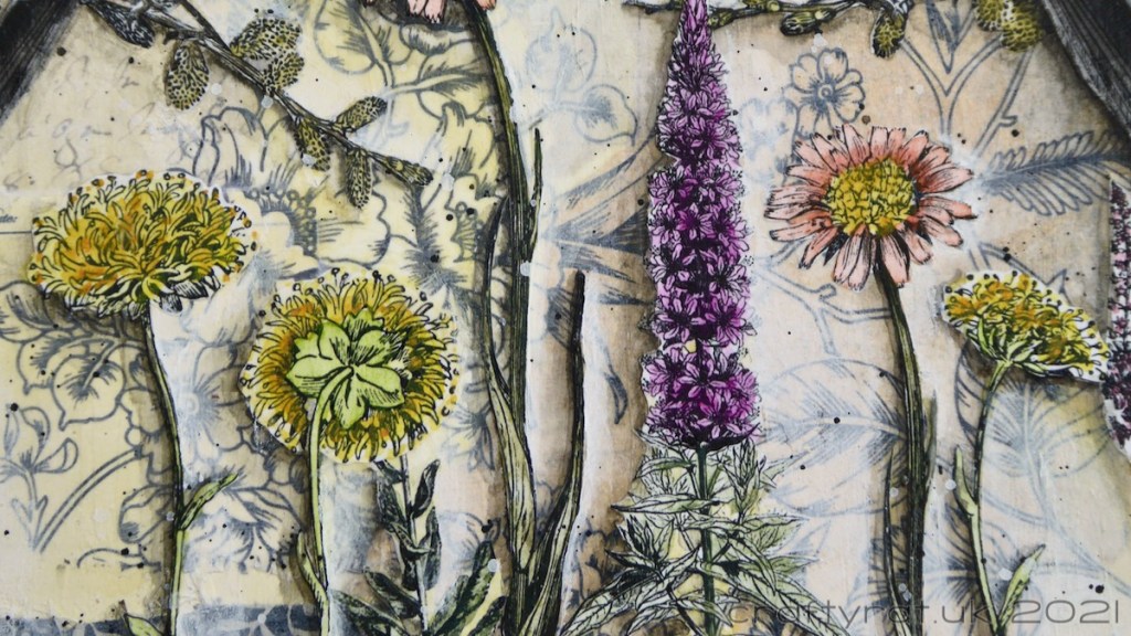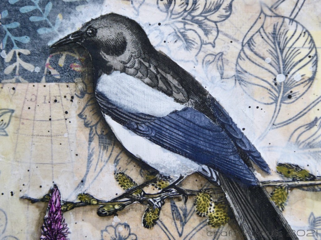 There’s not a great deal of recycling going on here, apart from a couple of tags, oh and the tissue paper which was packaging for something a long time ago, but there are a lot of papers that have been sitting unused in my stash for ages. I chose mostly neutral papers and tags for the background and overlaid the floral tissue paper — using gloss gel medium which turns it nicely translucent, allowing the papers underneath to show through. The flowers and birds are all black and white vintage ephemera from Tom Chalky that I printed out and fussy cut. I put down a layer of clear gesso before adding any colour; this took the shine off the gloss gel and created a uniform surface to work on.