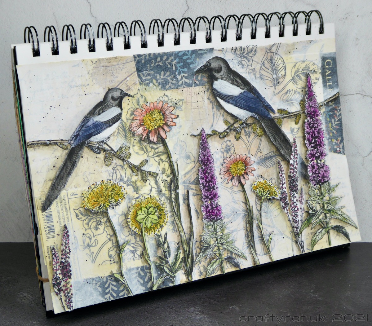 There’s a lot I like about this page: the way the collage papers are still actually visible (even the white gesso doesn’t completely block them out), the way the black and white shading really makes the flowers pop off the page, and the magpies, which just remind me of all the magpies that live locally.