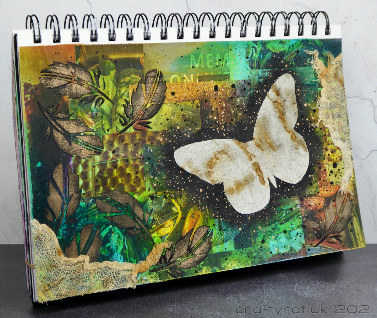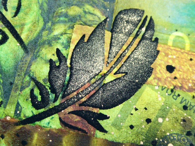 I don’t have any small butterfly stencils and I didn’t feel like stopping and making my own, so I picked a small feather stencil instead. The matt black paint was a little too subtle, especially on the darker areas of the background, but a light layer of copper sponged over the top perked it up nicely. After adding copper and black splatters, all that was left to do was glue some rust-stained gauze onto a couple of the edges of the page.