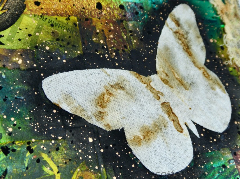 Once I’d got the collage layer down and dry, I added translucent acrylic paints over the top to make it feel more cohesive, while allowing the textures from the papers show through. My next idea was to repeat the stencil outlining technique from Dyan Reaveley’s Wanderlust week. That looked okay, but then I was inspired to cut my butterfly from the fabric and glue that over the masked area, turning the rust-dyeing into the focal point.