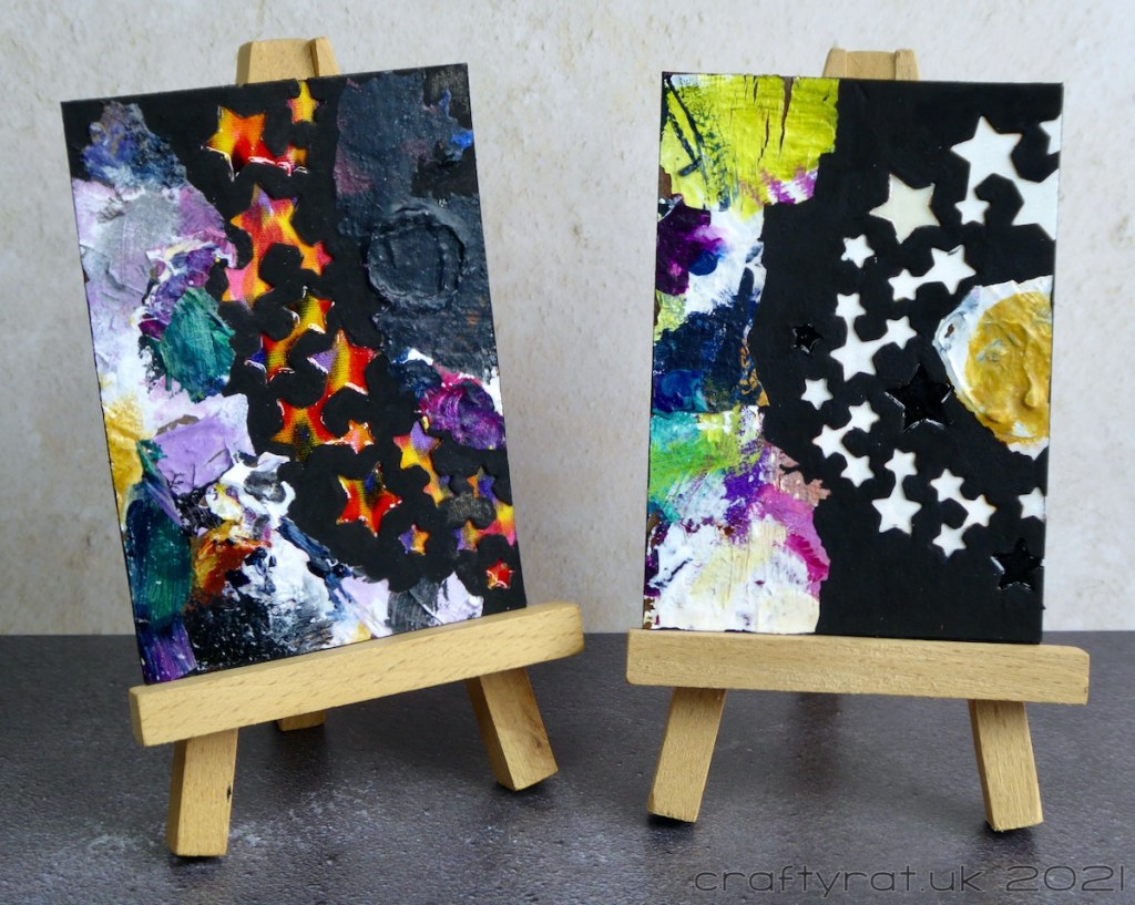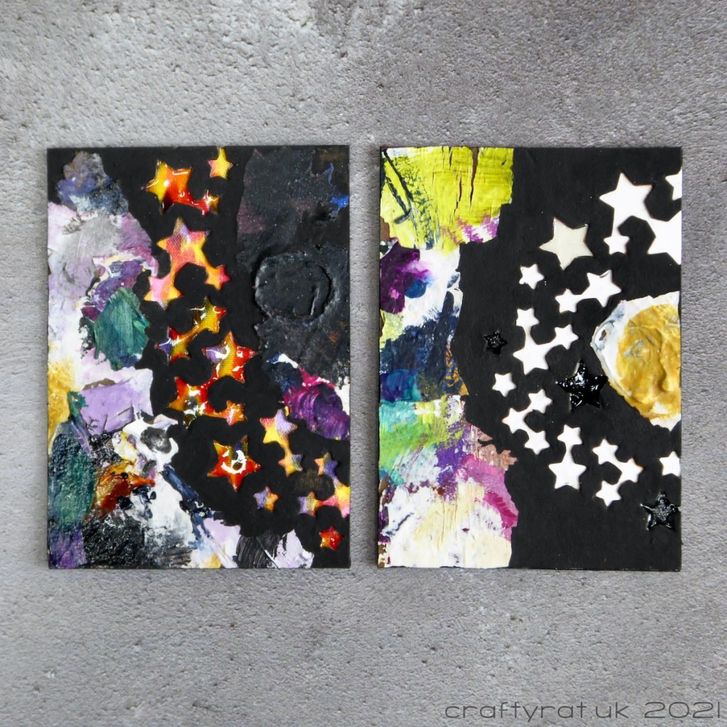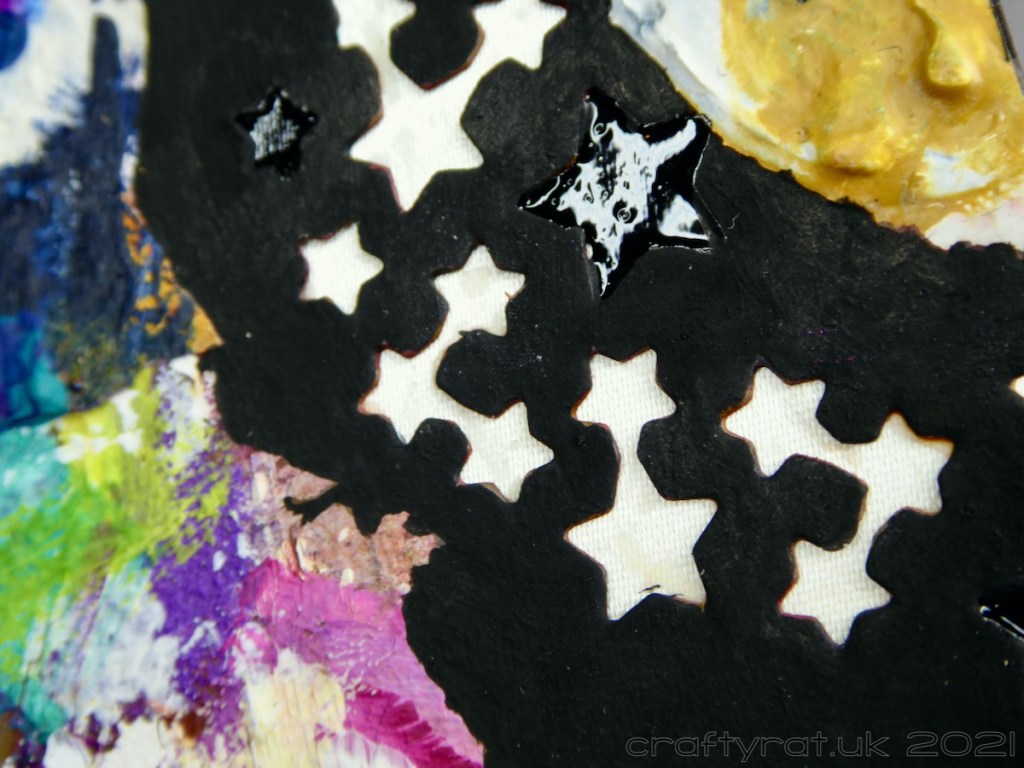 I can’t remember exactly what the next layer was made of — I think it might have been from a Ranger substrate pack — but I had tried die-cutting a garland of stars in it and never got any further with that idea. So I trimmed it into ATC-sized pieces and layered it over the fabric base. I tried colouring one with Copic markers to mimic the stars on the other card, but it didn’t work like I’d hoped so I painted them both black instead.