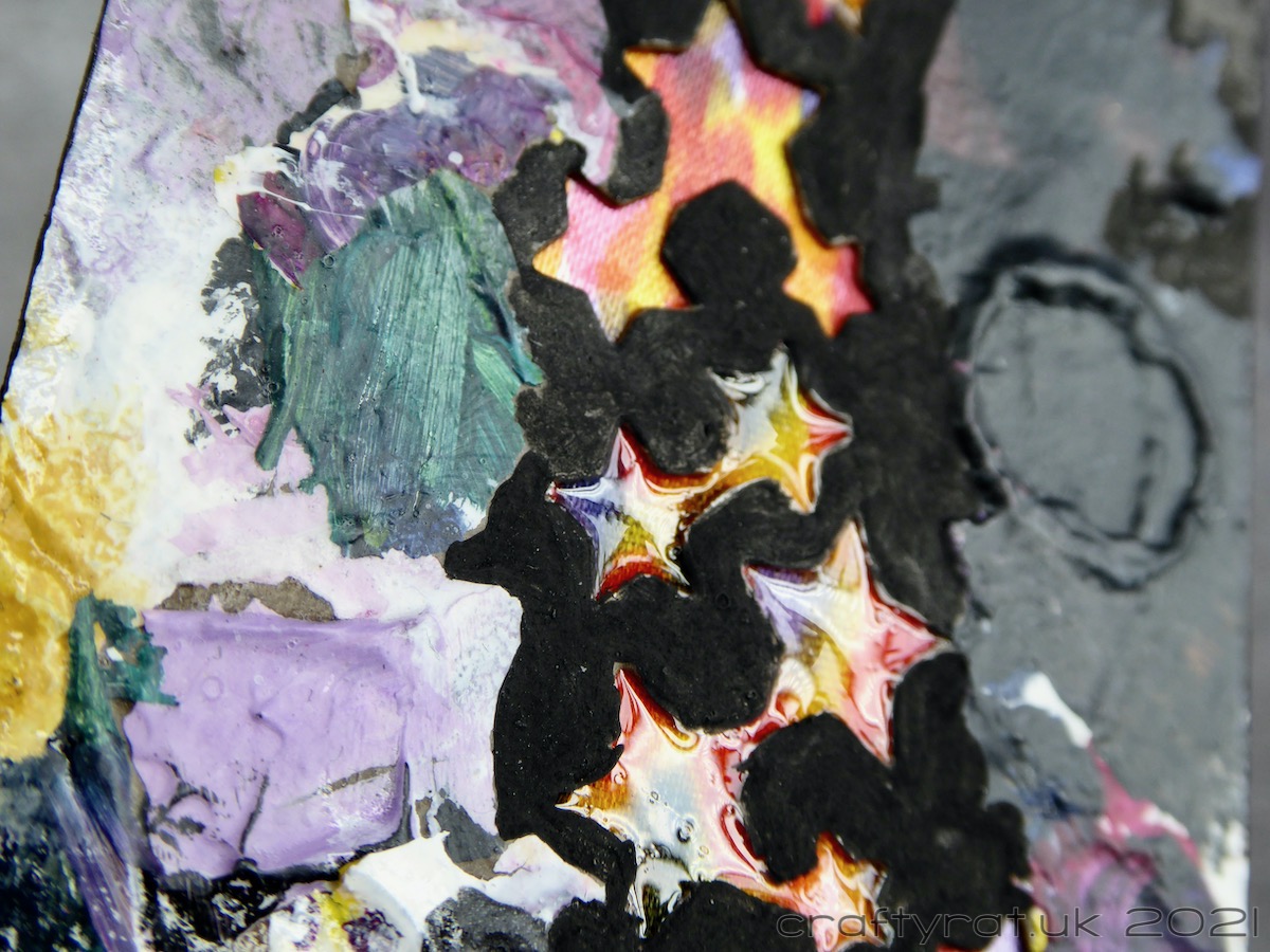 Next I added the last of my acrylic palette skins, including the piece that looks like a crater, and finished it off by putting Ranger glossy accents and black enamel on some of the stars.