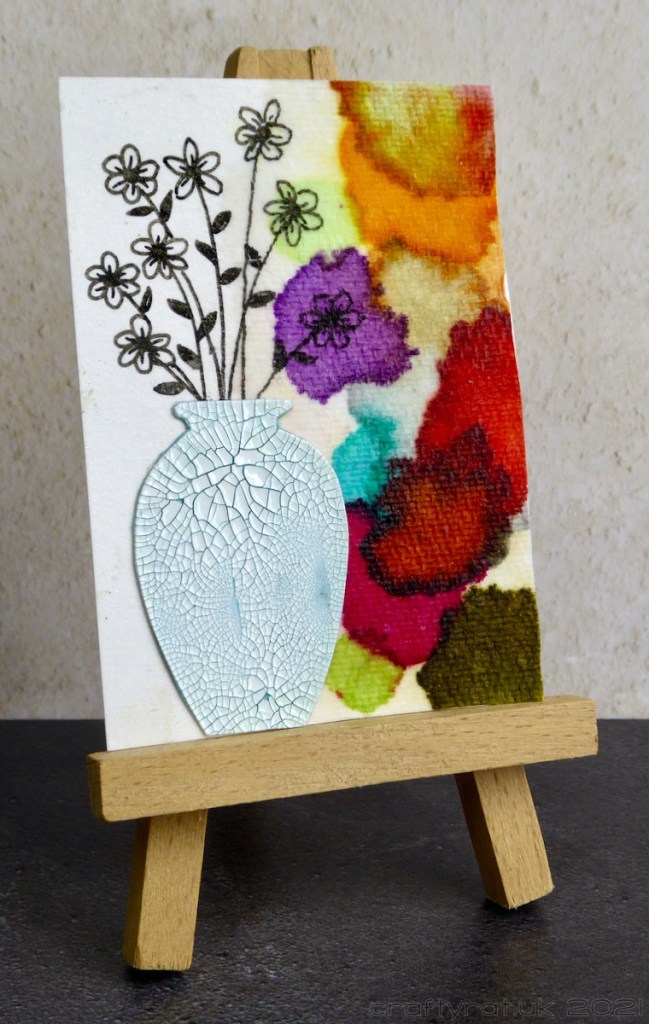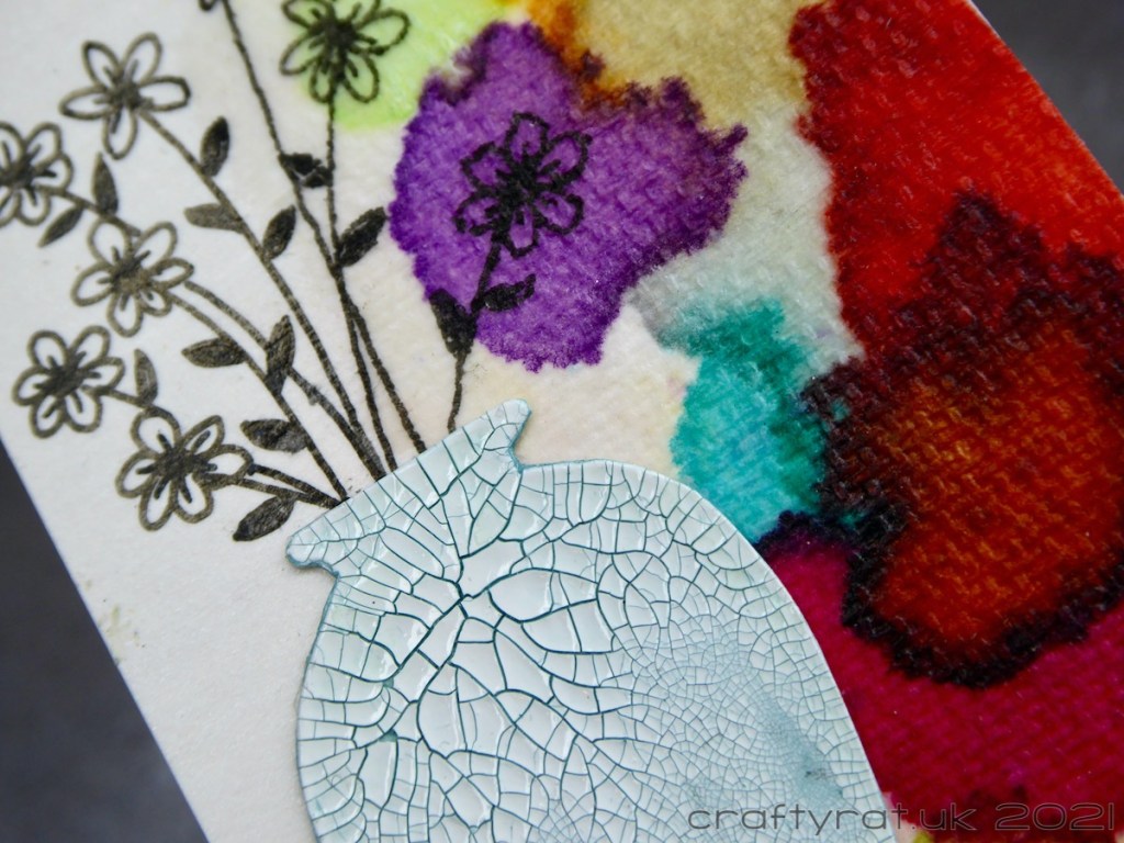 The crackle vase is much easier to place: that was a spare I made when I was creating this card. Crackle paste takes an age to dry thoroughly so I made a couple with varying thicknesses of paste in the hope that at least one would be usable.