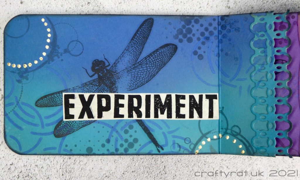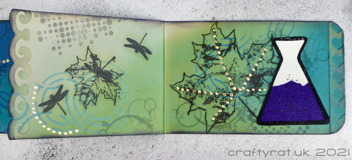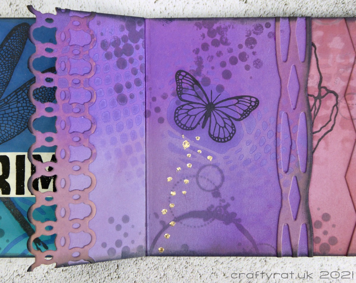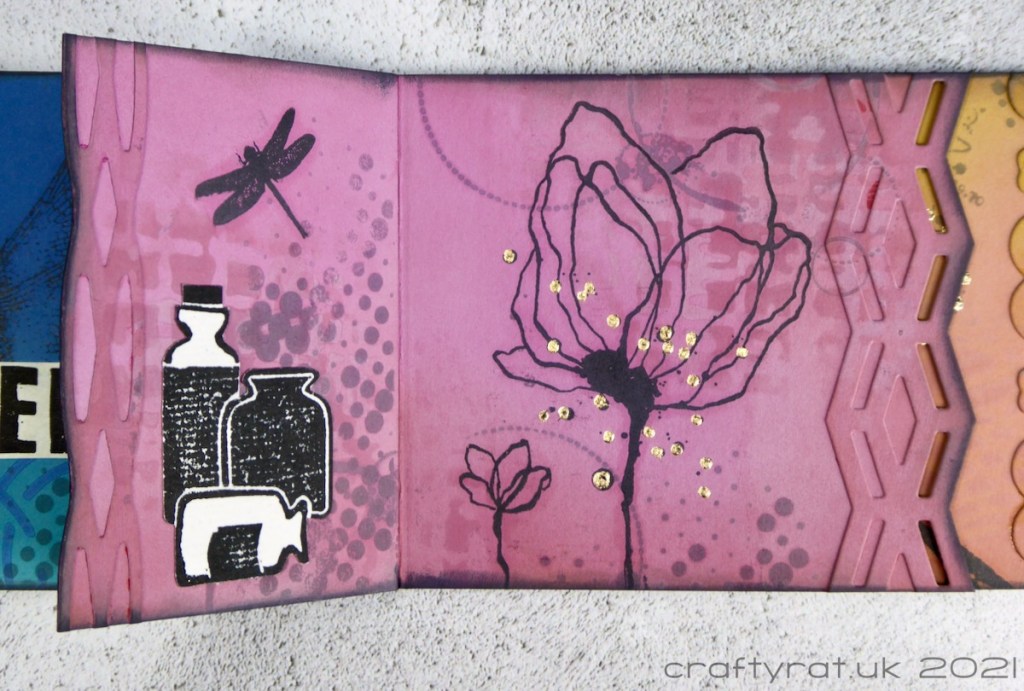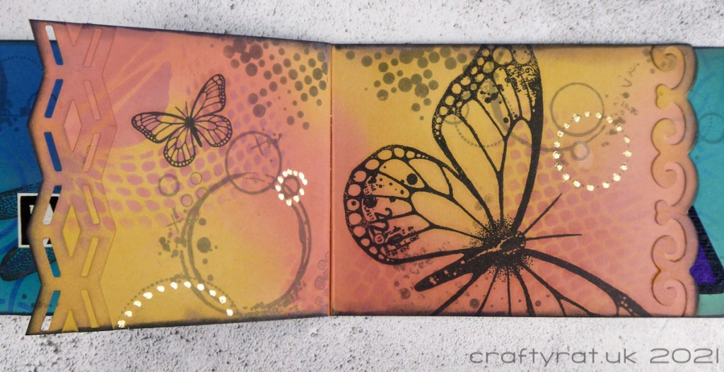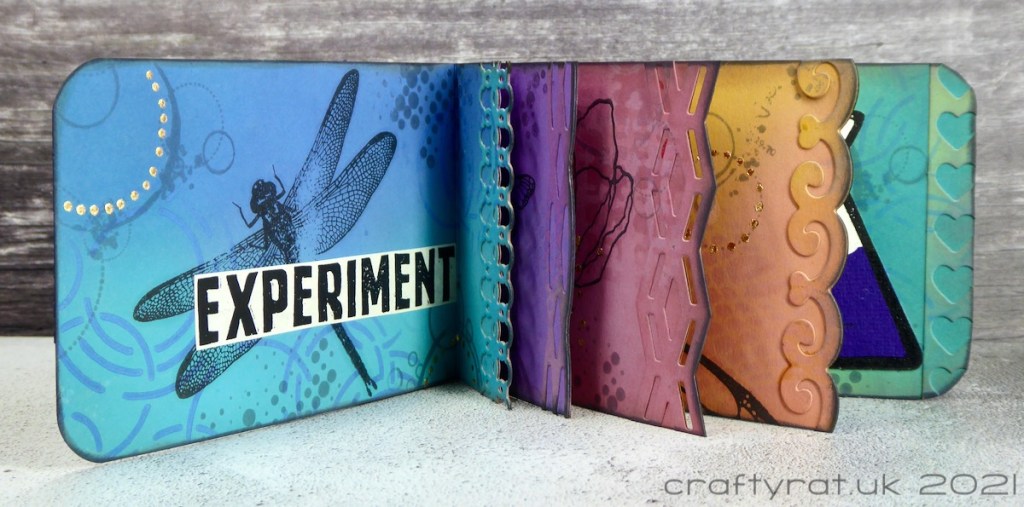 And I do quite like this one. I’ve not come across this way of assembling a booklet before and it was nice to get my Distress Oxides out for a change. And I finally got to use that set of First Edition border dies that have been sitting unused for quite a while. Of course, the downside to making a booklet is that there are so many surfaces to cover 🙂 It did take a while to make but it was fun to do. All the stamps and stencils are from Visible Image and I threw in some elements from my Experiment linocut test prints.