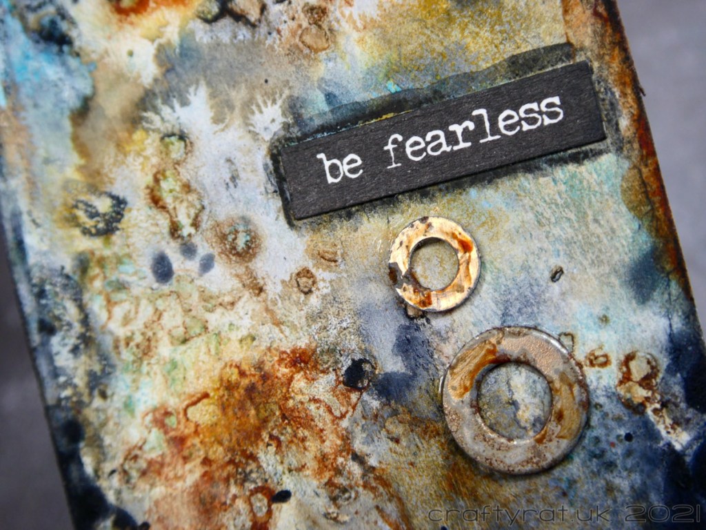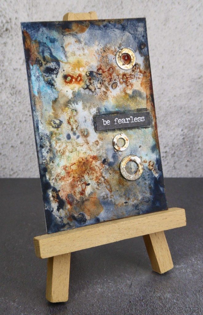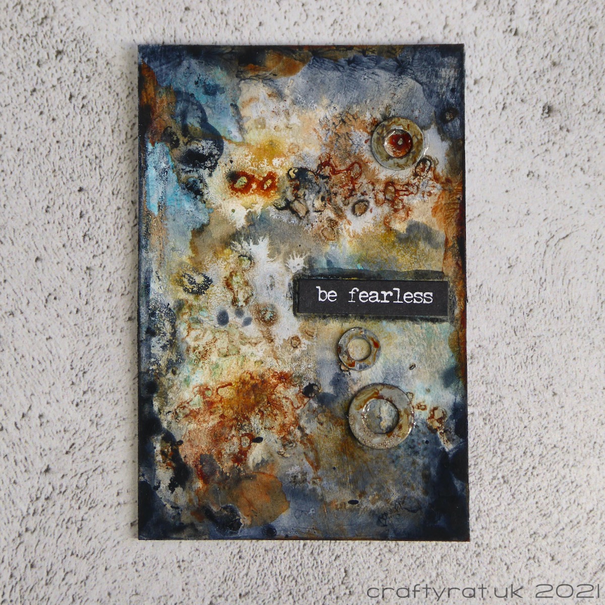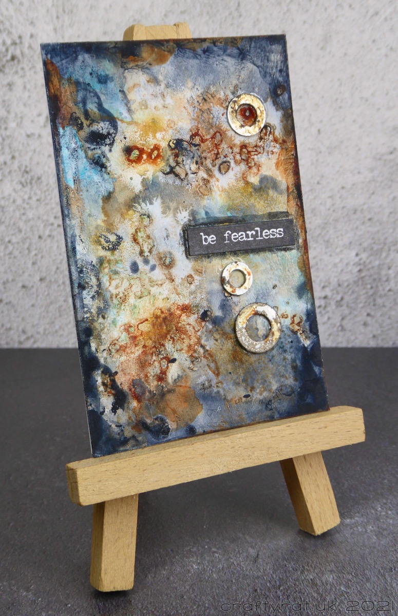 This card is Mags’ interpretation of the lesson for the fourth day of the challenge. (This was mine.) This is definitely my favourite of the three: I love the colour palette and those wonderful rust effects.