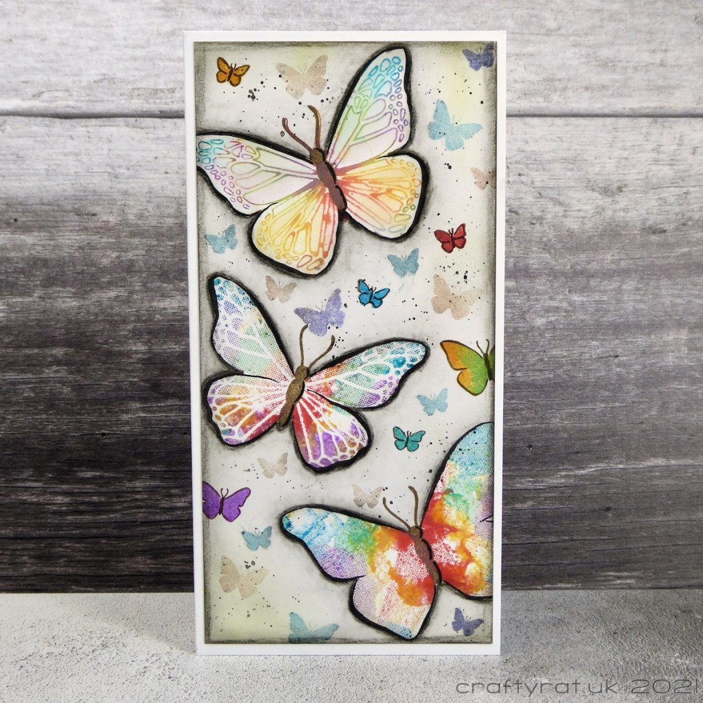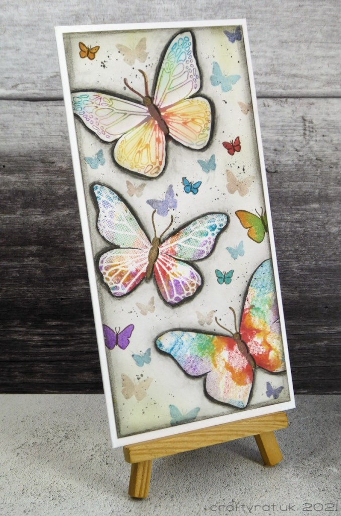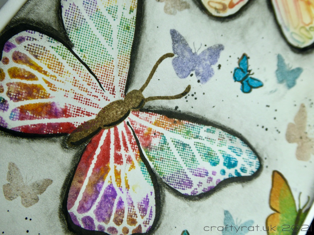 So, what did I use? The main butterflies were created using a stamping positioner, applying patches of colour to the stamp using Distress Oxide ink pads, stamping, and repeating. Then they were softly outlined with charcoal, with a finer black outline added with a brush and ink.