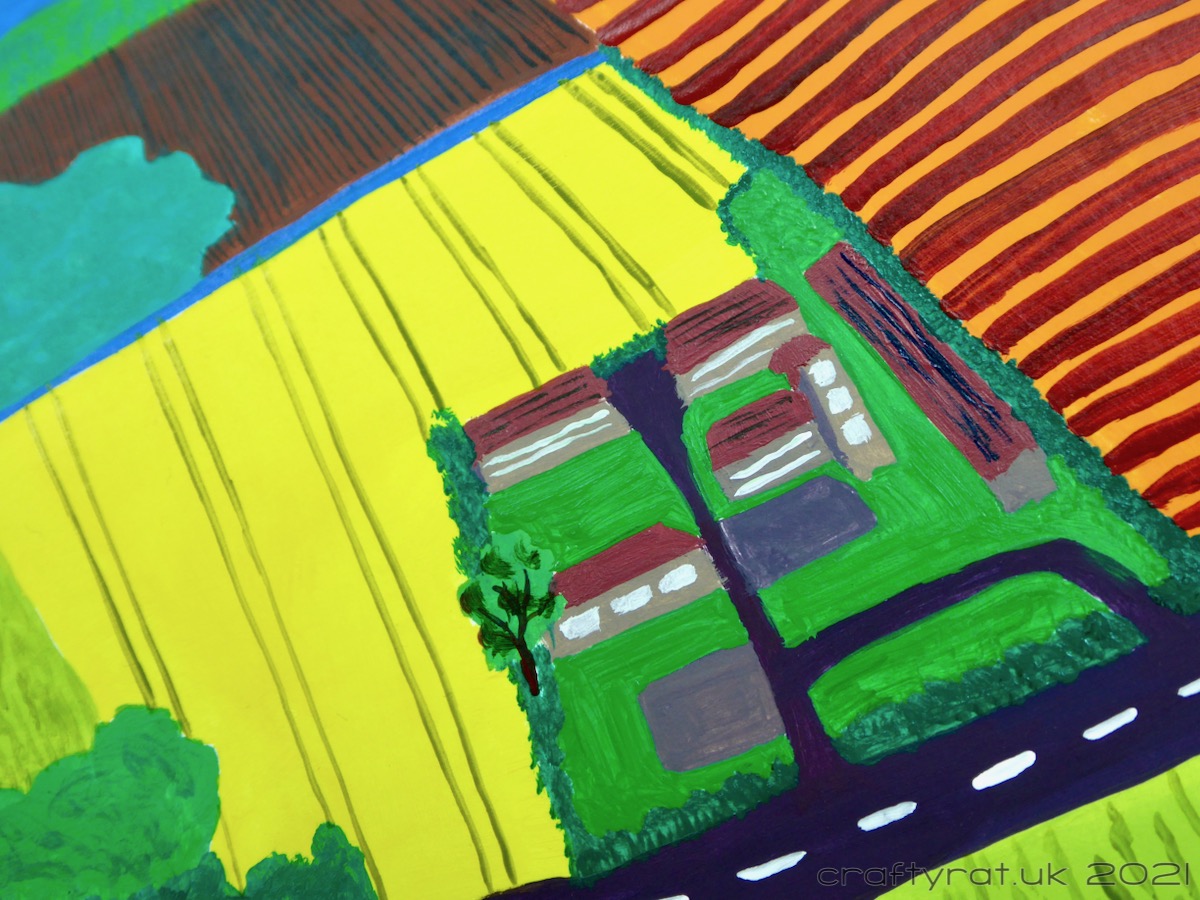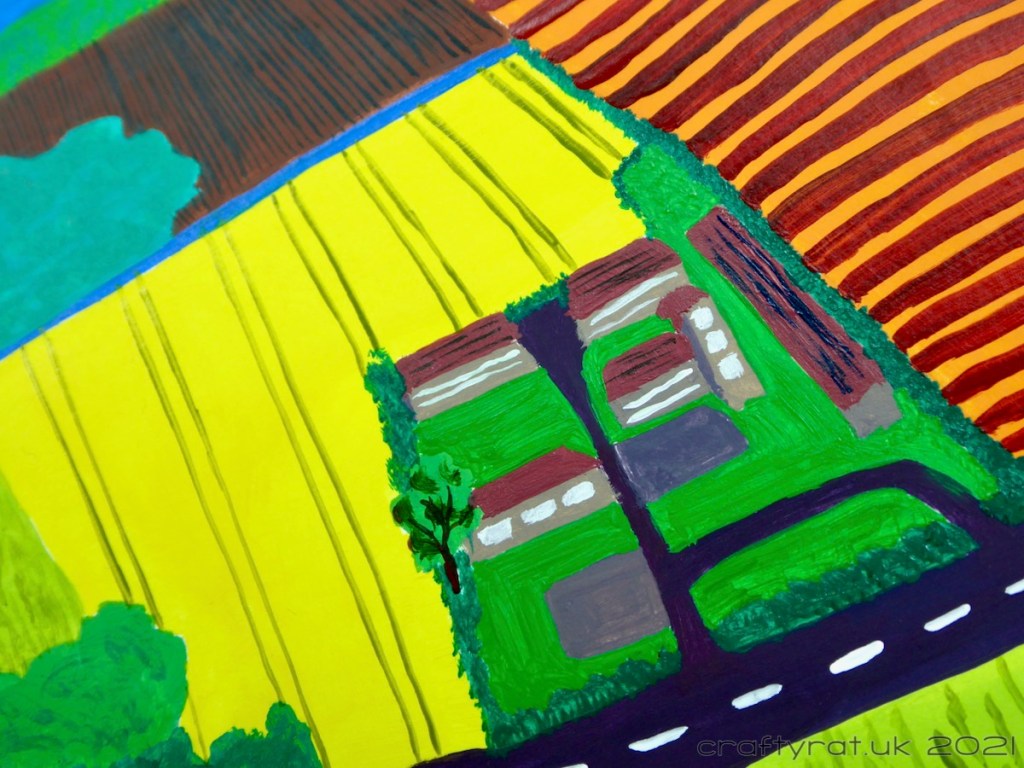 This is a simplified view of the small farm I grew up on (there were a lot more buildings) and the countryside around it. I wimped out a bit doing the initial colour blocks; I got the complementary blue and orange of the sky and field in place, but couldn’t quite bring myself to have a purple field next to the yellow. If we had been trying for a more surreal look I would have happily had pink skies and turquoise fields but this style is based in realism and I couldn’t get away from the fact that most of these fields grew wheat.