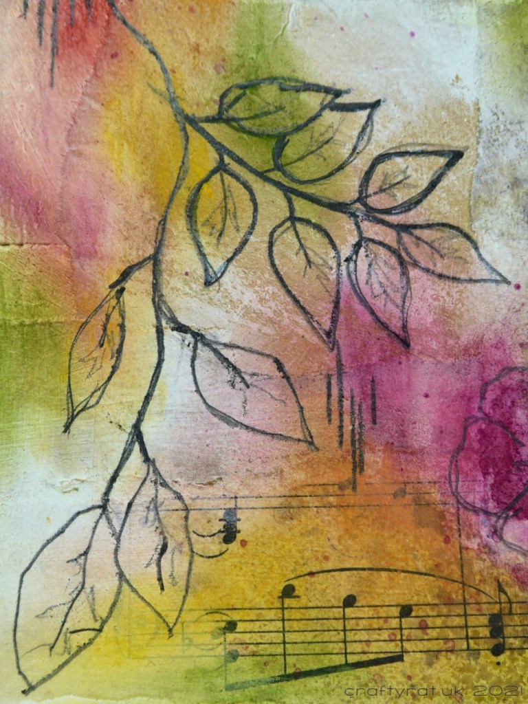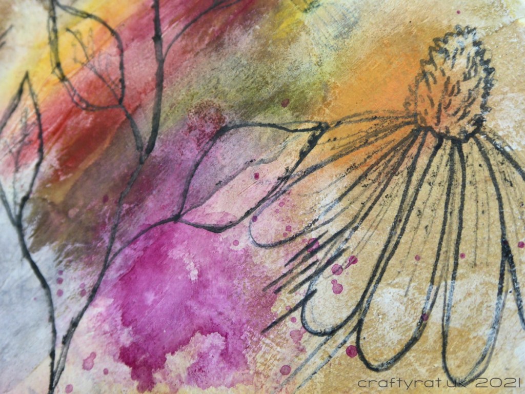 The starting point for this piece was to create a palette of colours inspired by flowers and to sketch some flowers and leaves on brown paper (for a change). The sketches were used as part of a collage layer and gesso was used to soften some of the edges. Patches of soft pastel added the base colour and some watercolour splotches and splatters gave it a bit of texture. Some mark-making — I’m rather taken with the groups of straight lines — adds more visual texture and then it’s all finished off with more sketching over the top to extend the initial collaged pieces