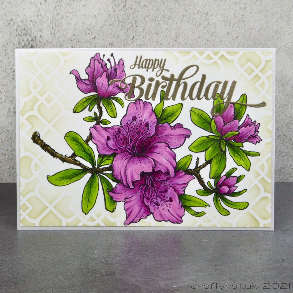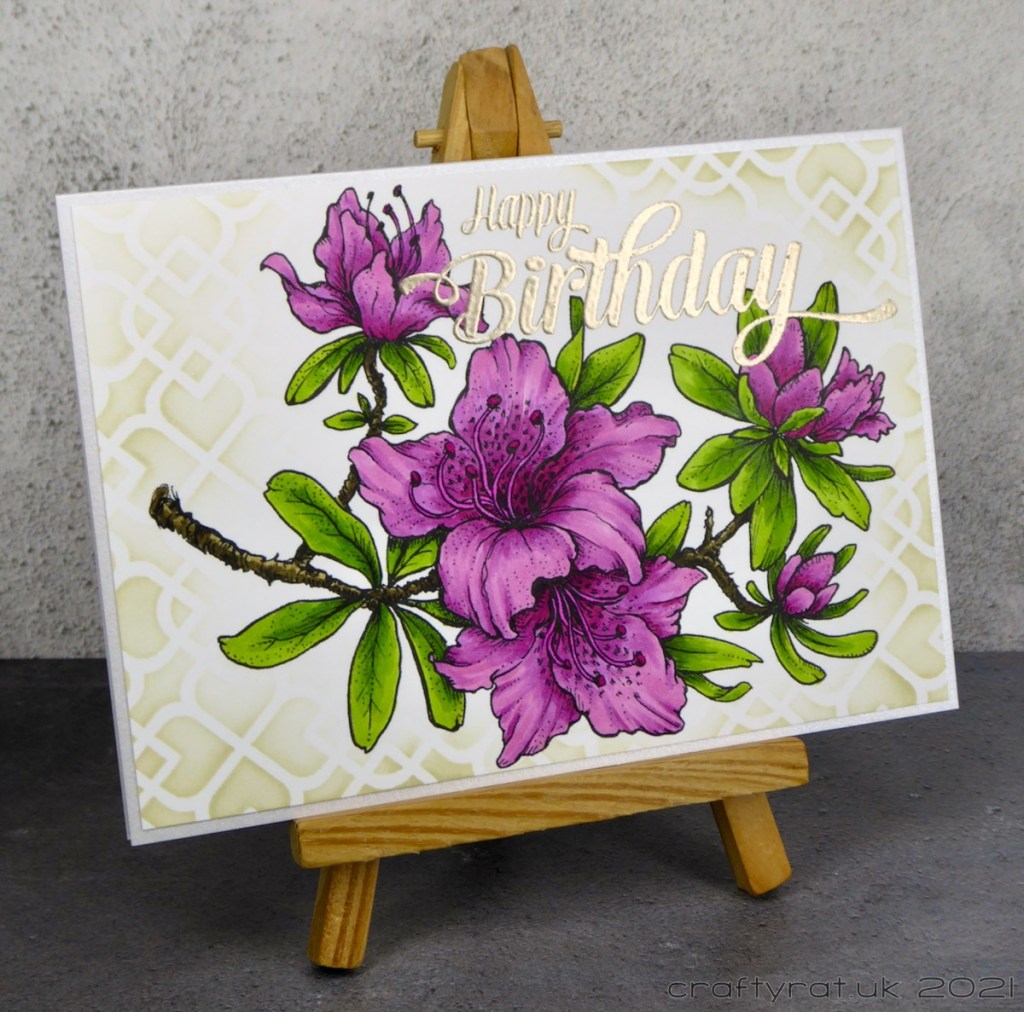 Like the peony bouquet card, I added a large heat-embossed sentiment. Unlike that card, I did not stop there. The shape of this digi stamp means that it doesn’t fill the card front well enough to just leave white space around it but I knew exactly which of my many stencils I wanted to use to fill in the blanks. I tested out a couple of the lighter pink Distress inks and wasn’t happy with how they fit with the colour of the azaleas so I switched to the old paper instead as that supports the image rather than fighting with it.