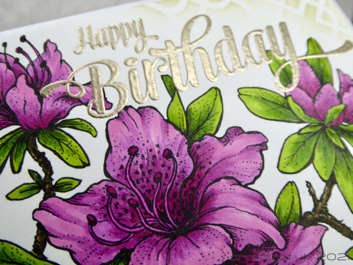 For a change, I actually felt like sitting down and doing some colouring for a card. I had a look through the last lot of Power Poppy digis I bought and narrowed it down to a choice of two: azaleas or magnolia. The azaleas gave me more colour options so they won out this time.