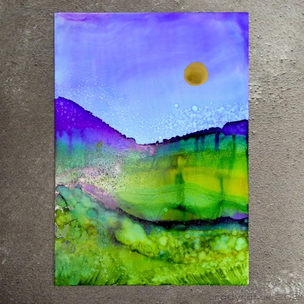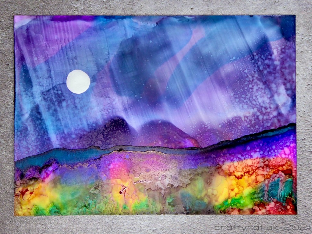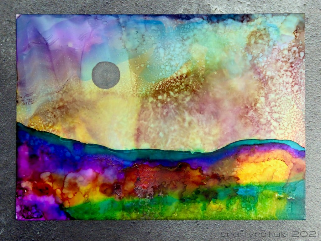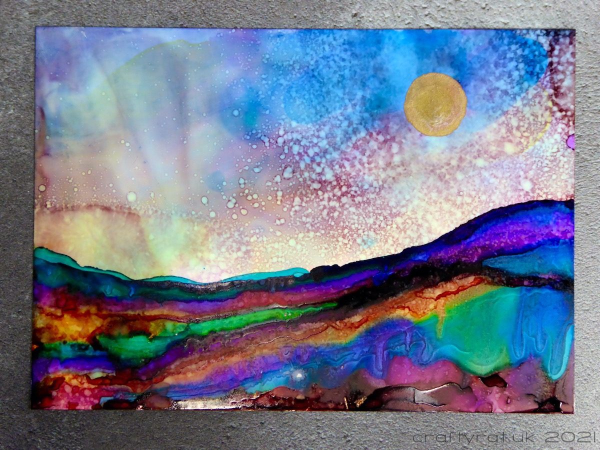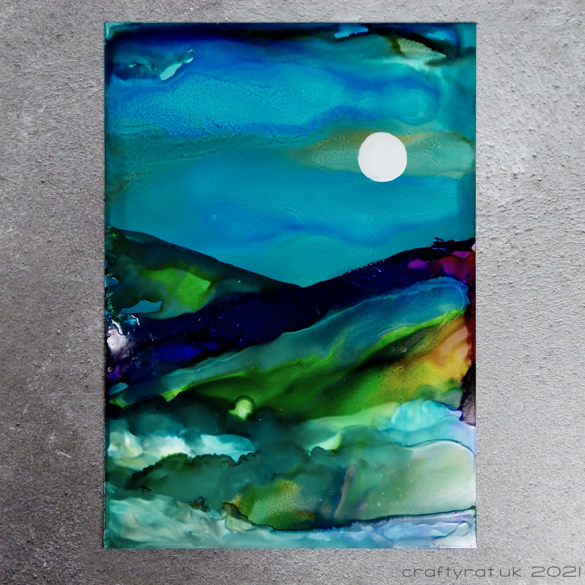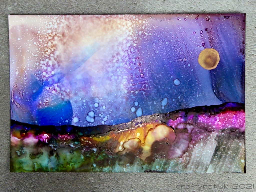 I was following the basic instructions in Alcohol Ink Dreamscaping, working out what I liked and didn’t. I’m not so keen on spritzing alcohol (that seems even less predictable than laying down the inks in the first place), and I cannot get the mixatives to naturally form a nice even sun/moon circle.