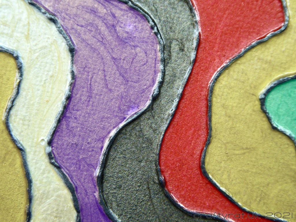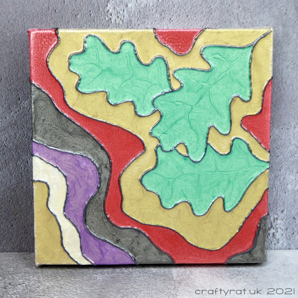 I sketched some oak leaves and then went over them with a tube of outliner — it’s designed primarily for using with glass paints but worked fine for my purposes — and then drew freehand contour lines around the leaves. And waited for it to dry. The colour choice was simple. I have two sets of six Pebeo solvent-based paints that haven’t had much use, easy solution: make two canvases, one with each of the sets. This canvas uses Pebeo Fantasy Prisme, which theoretically creates a honeycomb effect as it dries. I think it needs to be applied more thickly for the effect to work though — there is a hint of the effect in the red paint near the top edge — or it may just be that the paint is a couple of years old, or it might be the canvas substrate causing the problem. More experimentation is needed.