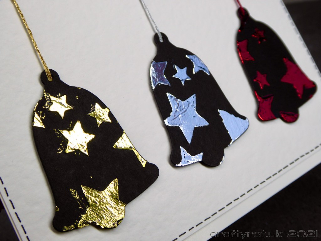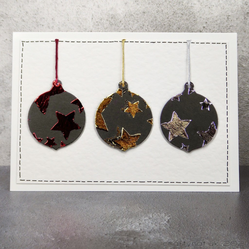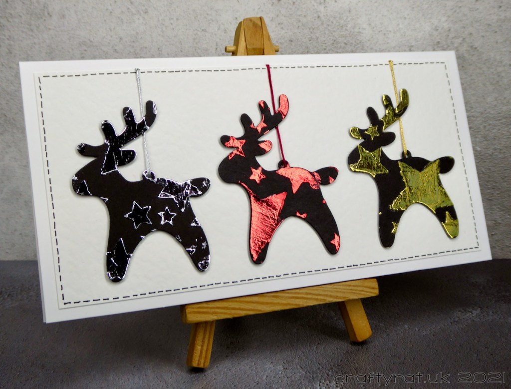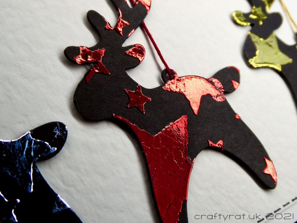 At the bottom of one of the boxes were these bells, baubles and reindeer. I think they must have been made around the time I was testing the Deco Foil transfer gel — which means they’ve been sat there for four years… I figured that was quite long enough and turned them into these three cards.
