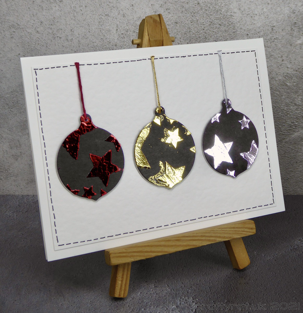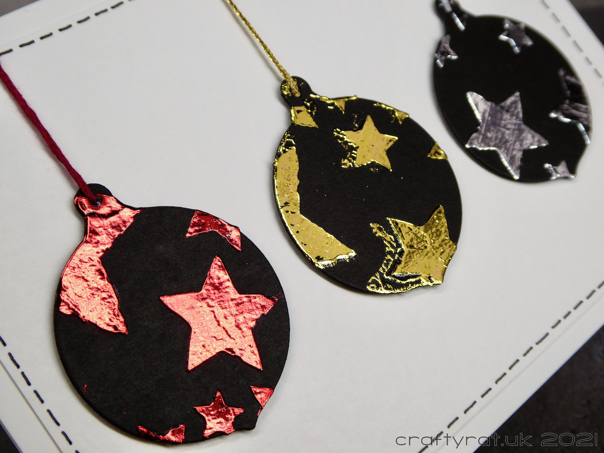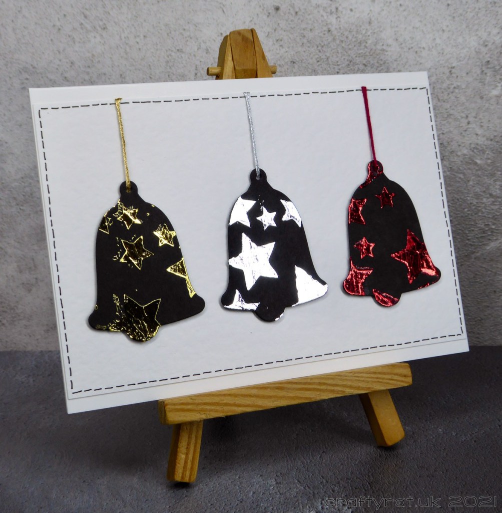 At the bottom of one of the boxes were these bells, baubles and reindeer. I think they must have been made around the time I was testing the Deco Foil transfer gel — which means they’ve been sat there for four years… I figured that was quite long enough and turned them into these three cards.