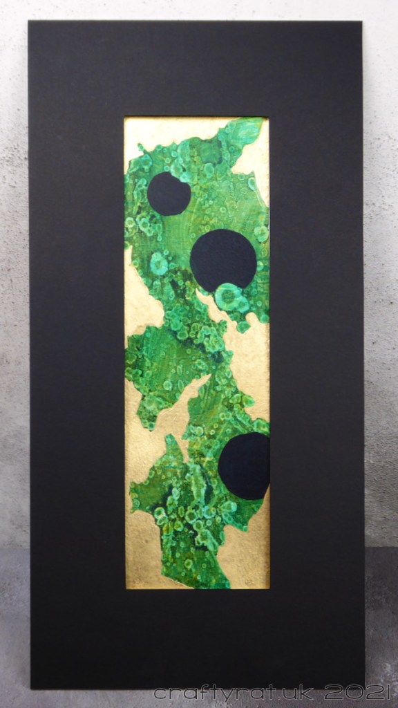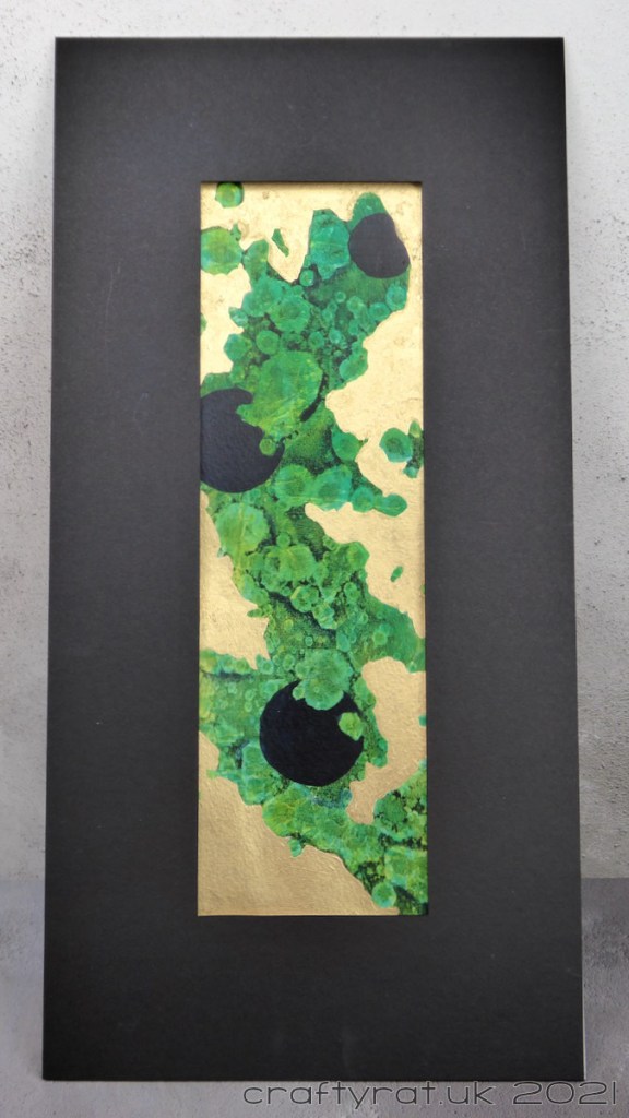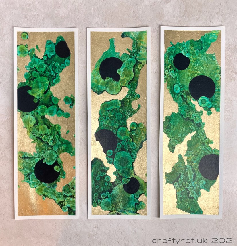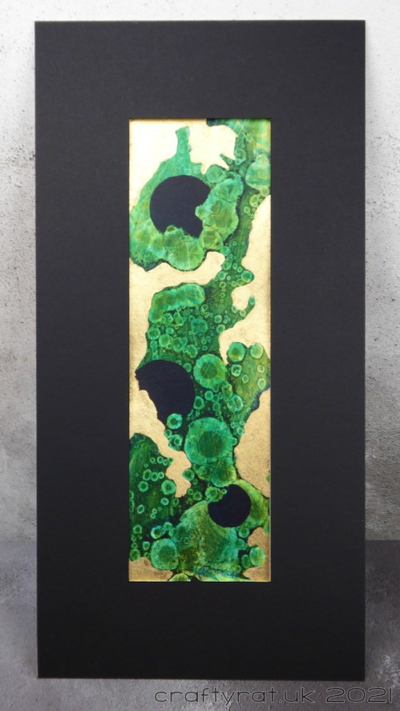 I was tidying up a bit and found three strips of paper left over from another project (from cutting the paper into squares for the Woodland abstracts). Rather than put them away and continue tidying, I turned them into this abstract triptych with acrylic paint, alcohol and gilding flakes. The tidying still isn’t finished…
