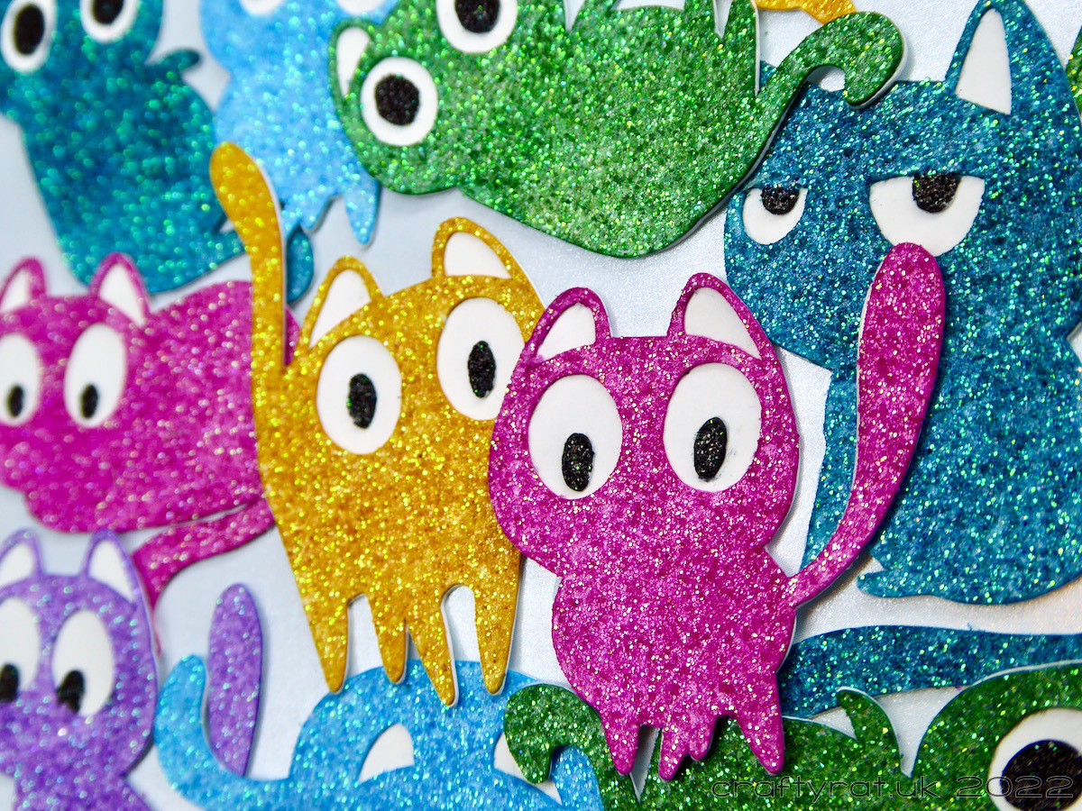 On to the coloured glitter layer. I do have several colours of glitter card that I could use, but rather than work out which cat shapes needed to be cut out of which colour to ensure an even spread, I cut them all out of white glitter card.