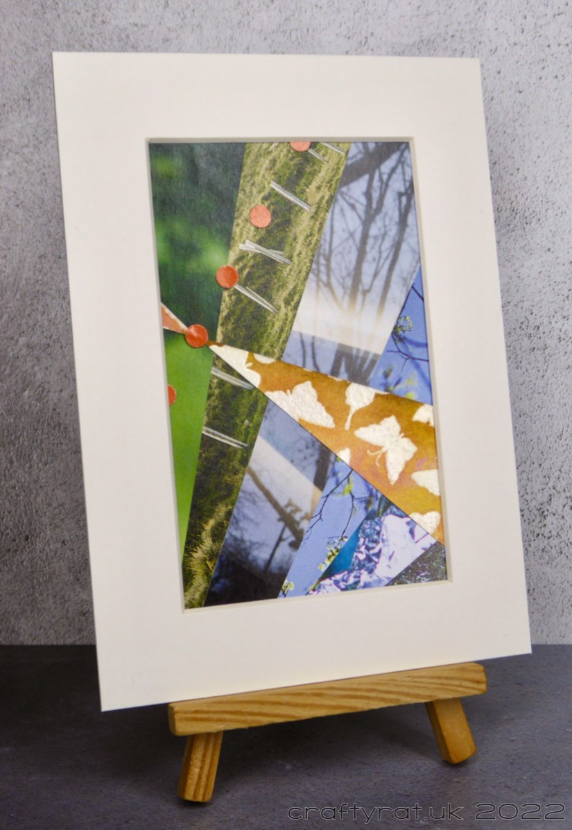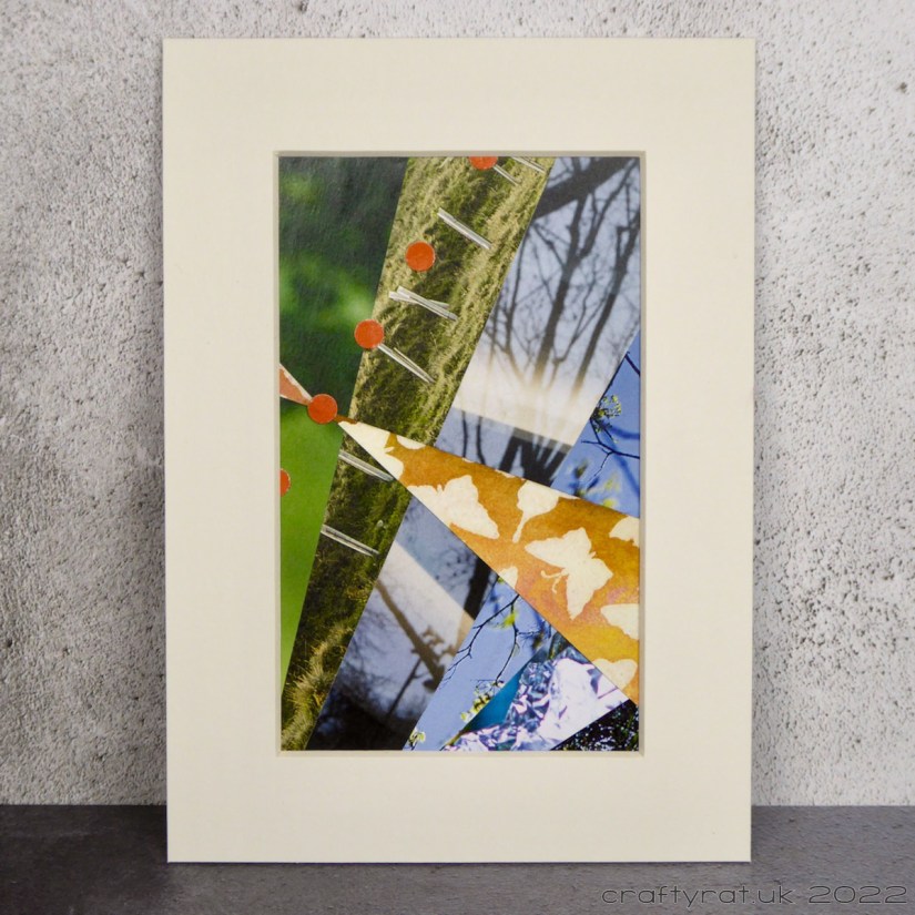 So I found some interesting nature images instead and created a fan of blues and greens. I loved the orange in the first of these collages and still had some scraps lying around that I used to punch the small contrasting circles from — I had to glue the magazine paper to some thin card first, my punch wouldn’t cut the thin paper cleanly otherwise.