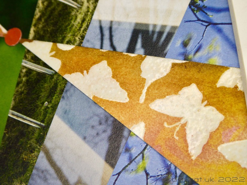 The orange butterfly strip was from a piece of pre-embossed resist patterned paper leftover from something, though I can’t work out what exactly. I carefully cut the triangle to echo the angles of the highlights on the background piece with the tree branches. Then I finished it off by adding the line of orange dots perpendicular to the direction of the butterfly triangle.