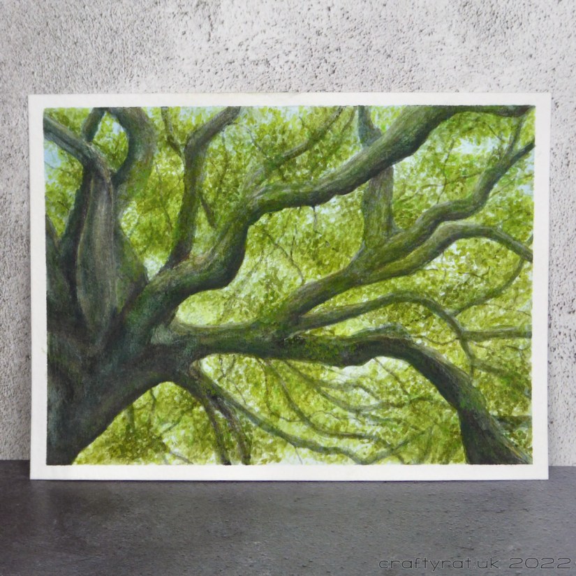 I used a grid to transfer the design onto paper, not something I’m sure I’ve done before, but I didn’t want to trace it. I decided to use watercolour as my main medium for this piece, and started with a wash of pale blue before painting in the branches and patches of leaves. I could have left it at that, but I wanted to add more depth to the colour and more texture, particularly on the leaves so I broke out my coloured pencils.