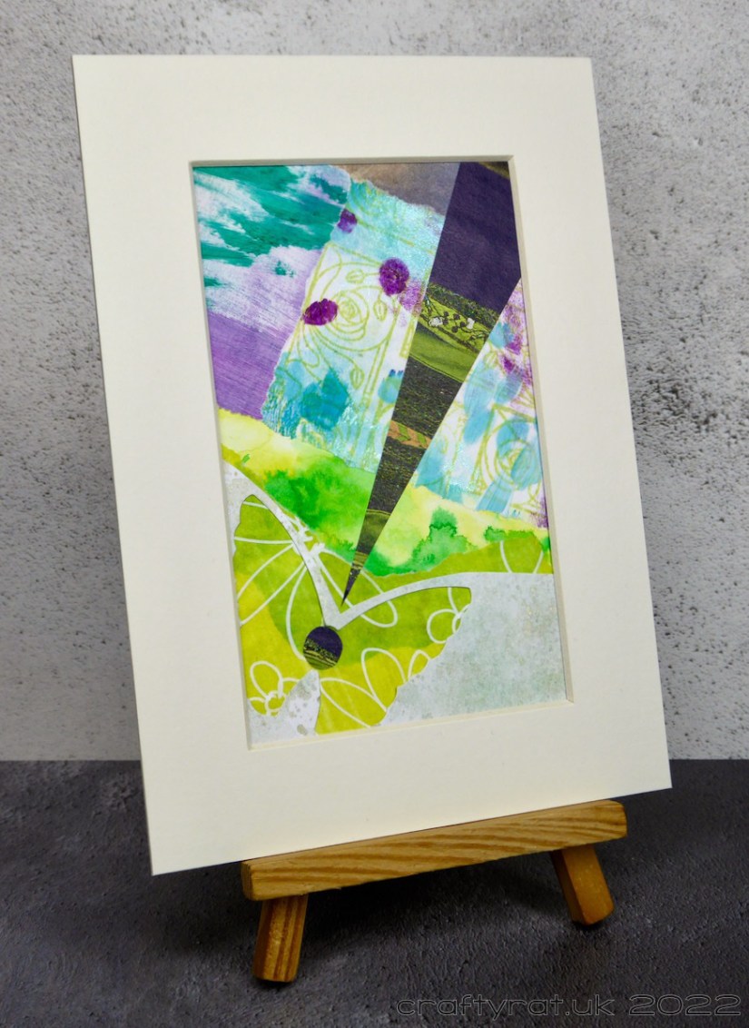 Before it got lost in the stash of papers again, I thought I ought to make something with the die-cut butterfly outline I’d started with on the last mini collage.