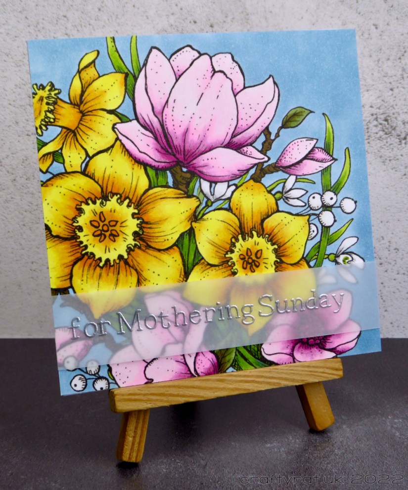 The sentiment is hand-stamped with individual letters. For my mum, Mother’s Day has always been Mothering Sunday, and no-one does “Mothering Sunday” stamps. But that’s what alphabet stamp sets are for. And because I was lazy, I used it on both cards. I did think about doing a matching “Happy Mother’s Day” vellum band for the other one, but the desire to get the cards finished and not faff around too much won out. I do like using vellum bands on cards like this; it makes the sentiment clearly visible without completely obscuring the colouring.