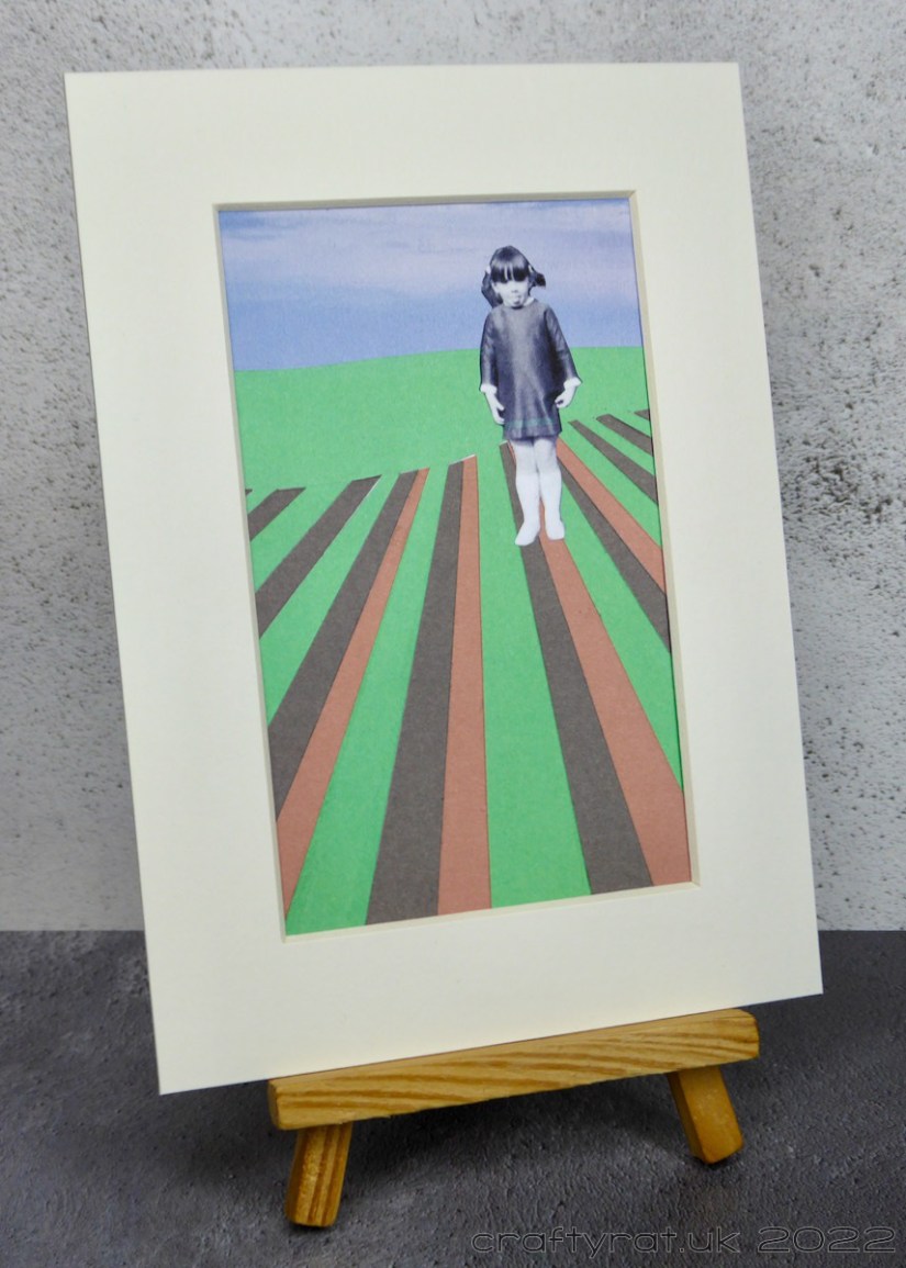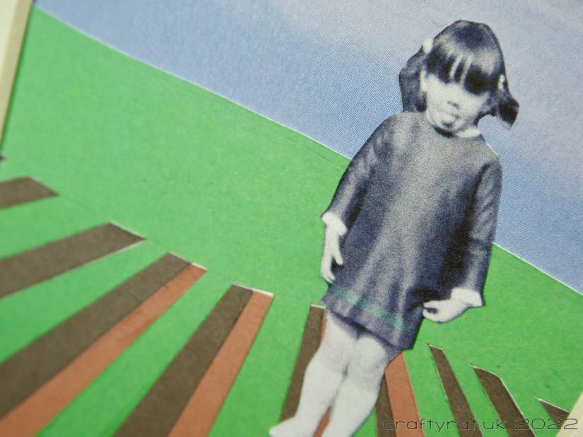The example in the book uses a side-on view of stairs for the perspective element but, not wanting to simply copy that design, I chose instead to create a ploughed field effect. The girl standing in the field is from a very old photo of me — I’m not sure how old I was there but it feels like it might have been taken at the start of a school year. In the original photo I am standing on the grass in front of one of the farm buildings, but we were surrounded by arable land so the ploughed field is an appropriate setting.
