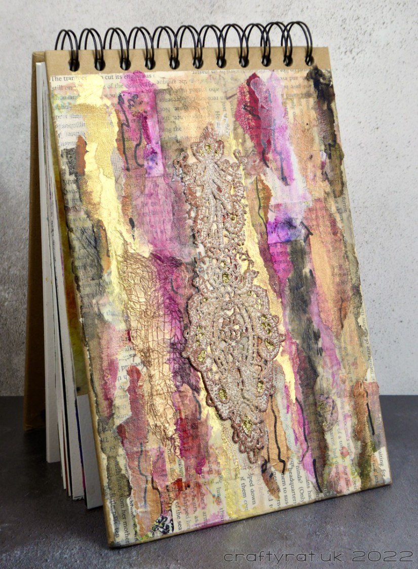 This is one of the things I like — a grungy colour palette with bright pink to lift it and a lot of texture. I started with a layer of torn bits of book pages over the whole cover, some more colourful collage papers, and a few scraps of lightweight fabric. Then I got the colour out and added some drippy pink, gold and black. For the central element, I trimmed out a piece of lace edging and soaked it in ivory Powertex which would both stiffen it and glue it to the cover. Once that was dry, I used gilding waxes to finish it off with a bit of colour.