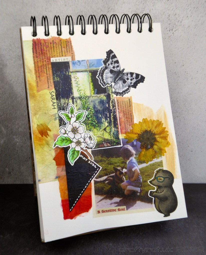 To the photos, handmade papers and collage elements, I added a couple of Copic-coloured pieces — flowers and a cute critter — from my stash because Copics are my go-to for relaxing art I don’t have to think about too much. I could get deep and meaningful about how the mole represents me stumbling along in the world before being diagnosed autistic, but that wasn’t why I put it there, in truth, it’s just a cute critter that fit nicely on the page 🙂