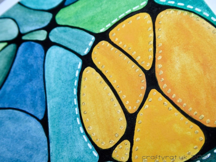 That aside, I did enjoy following the recipe: doodle lines across the paper making sure there are no loose ends visible, round all the places where the lines cross, optionally add more lines (I chose to add a circle), smooth the new corners, and add colour. I also decided to add some gold dots and white line detail at the end. It’s a while since I made this, but I’m pretty sure I used my Derwent Intense travel set for the colour, a black Posca marker to go over the lines, and gel pens for the gold and white details.