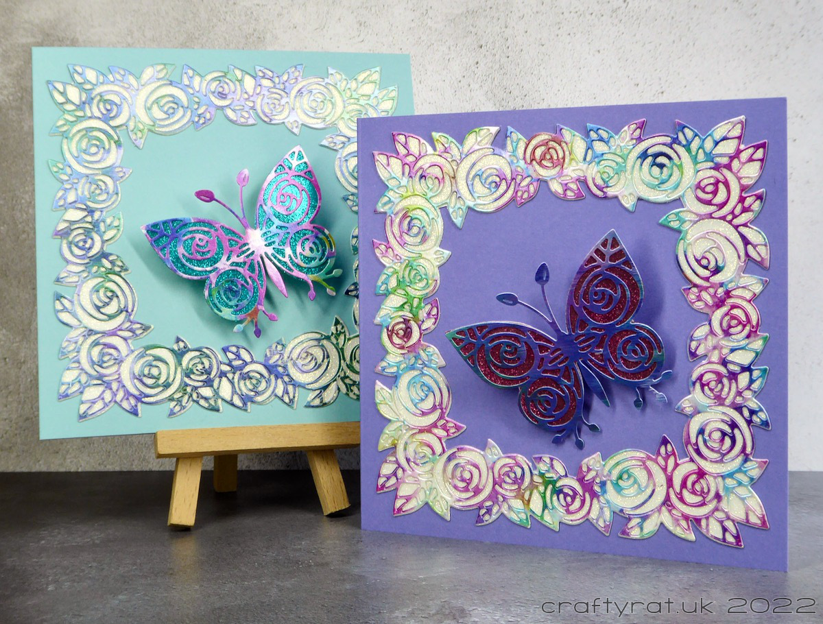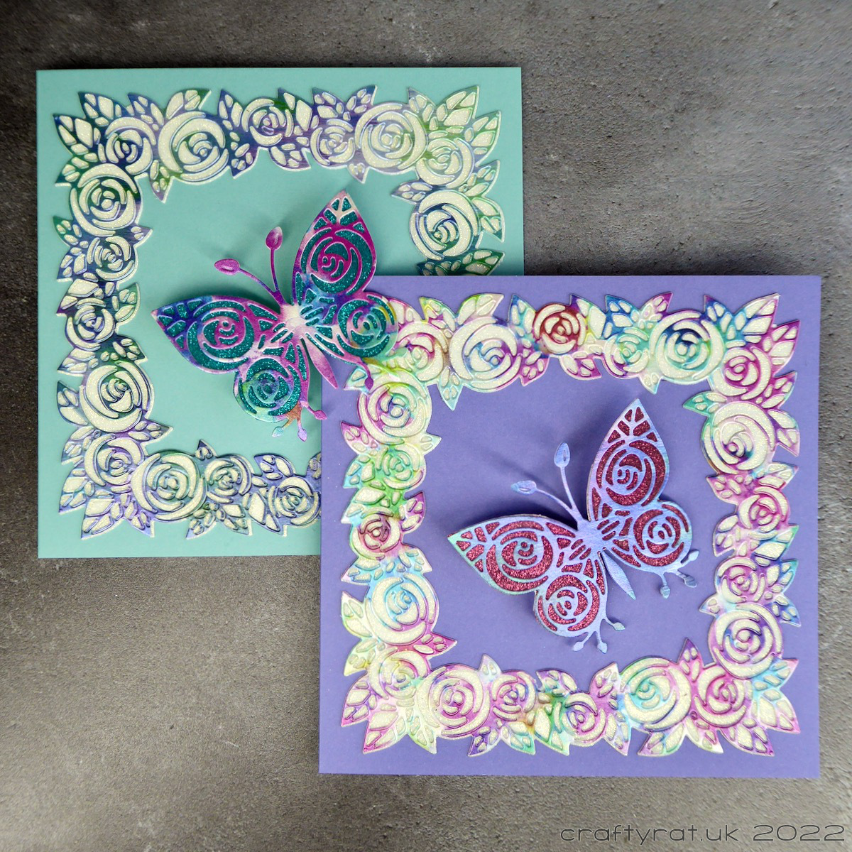 I decided to use this rose frame and butterfly set and if I had just used the dies to cut the frames like I did for my fabric flowers card they wouldn’t have taken long to make. Likewise I could have die cut the butterfly like I did for this note card, but that would have been too simple. No, I wanted to glitz it up a bit and fill them with glitter. If only the set had come with solid versions of the detail dies…