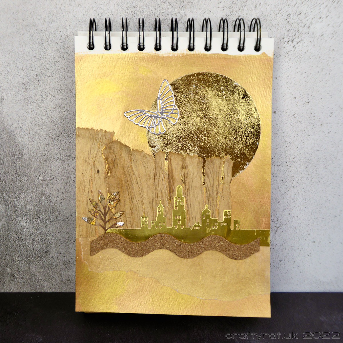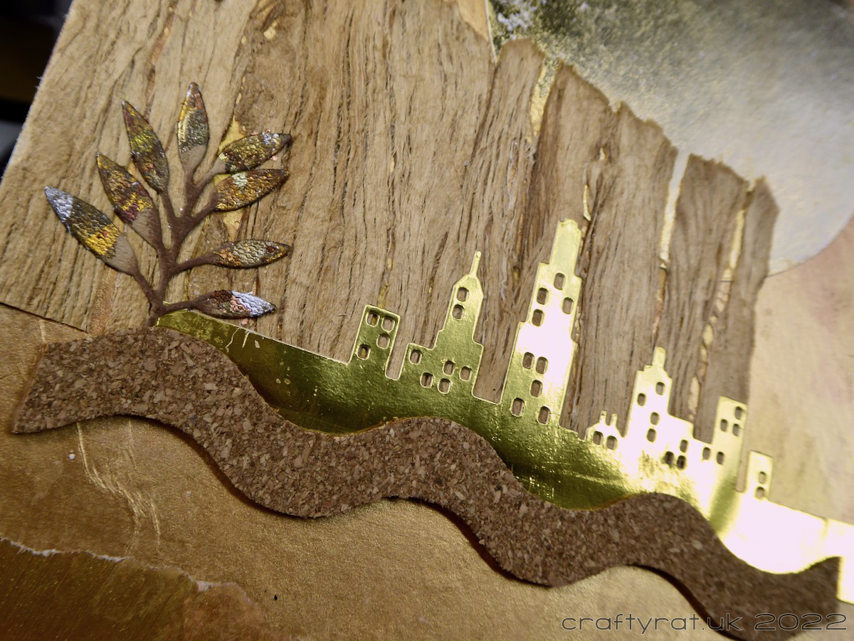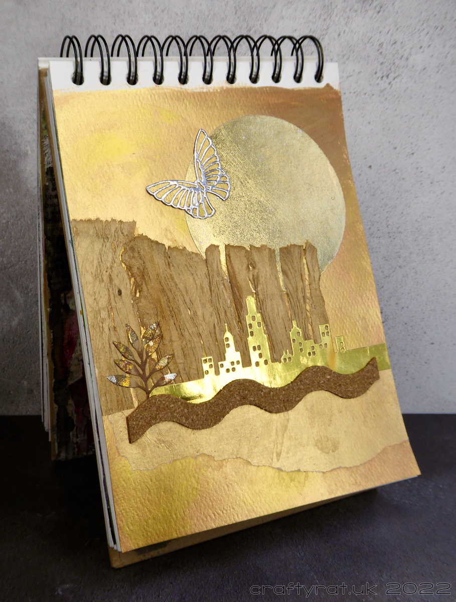 I painted the page with a mix of gold paints and played around with the pieces until I was happy with the design. Apart from cutting down the Paperdecoration (dried and pressed mulberry wood) that the cliffs are made of and trimming some overhanging pieces, everything else is exactly as it came out of the scraps box. And I’m really pleased with how it turned out.