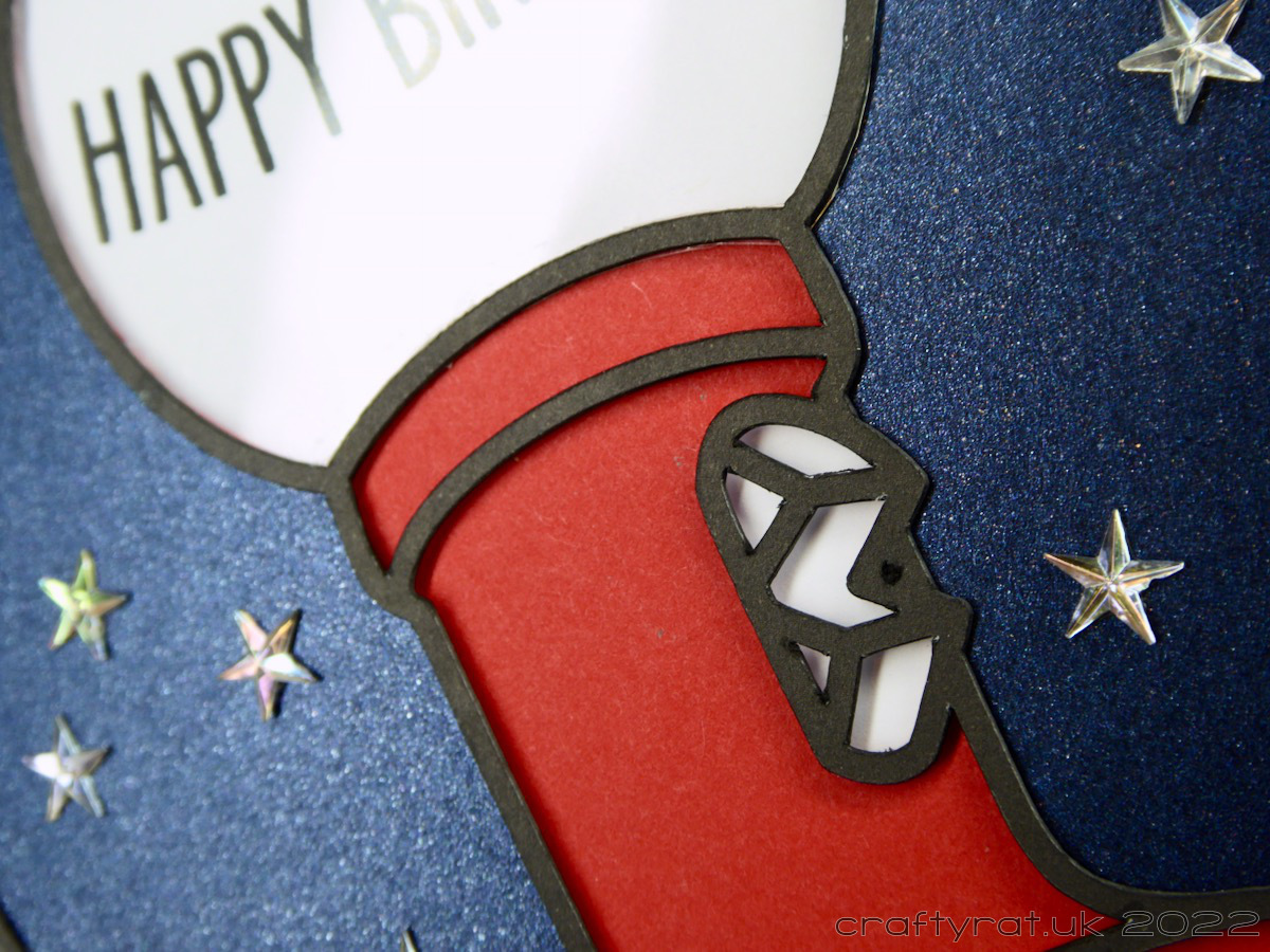 By the end of the second day I had all the pieces cut out and on the third I very carefully assembled it — the lines of the detail outline on the top layer could have been a little wider, there wasn’t a lot of room to glue it down around the edge. I was lucky and managed to find a “happy birthday” stamp that was just the right size to fit in the bubble.
