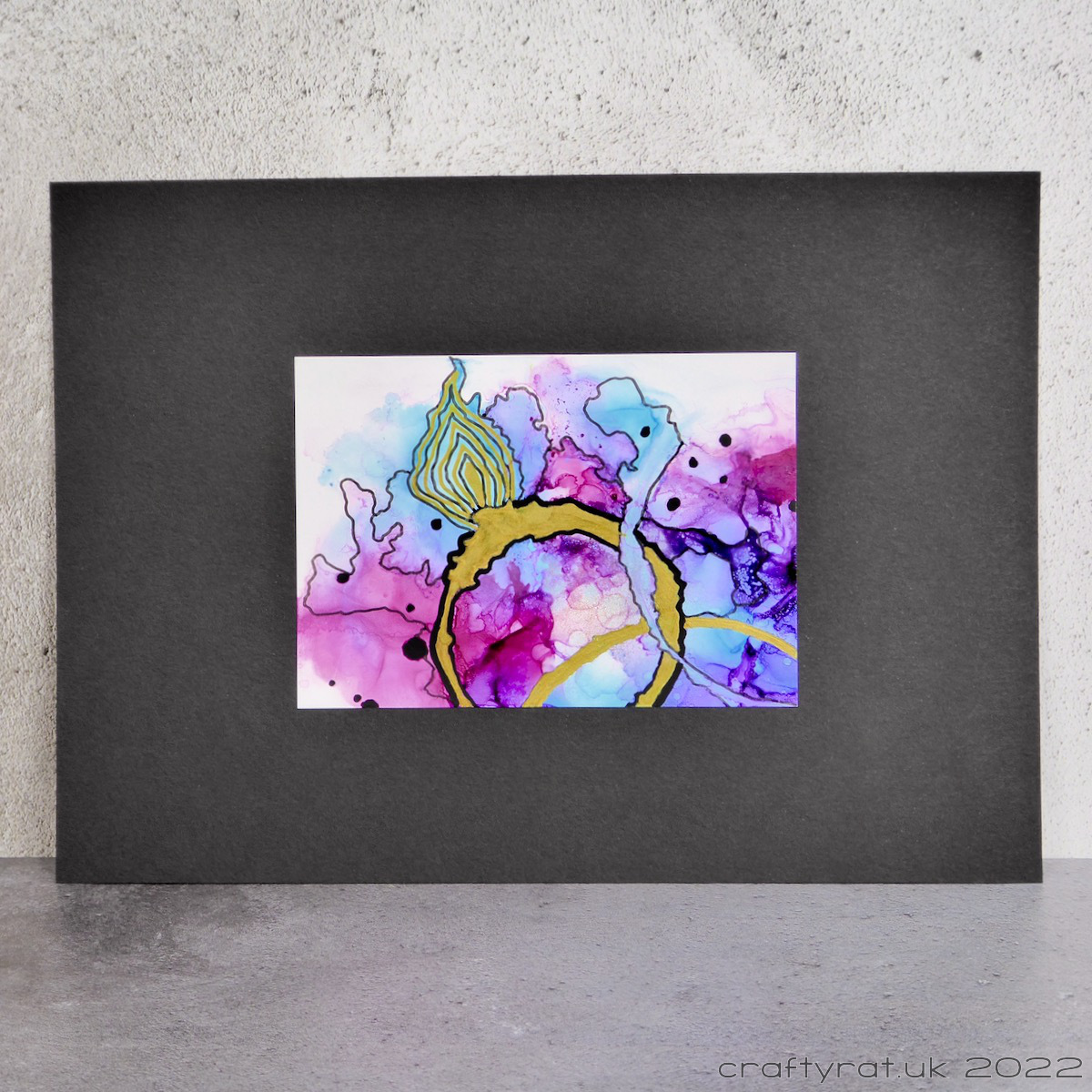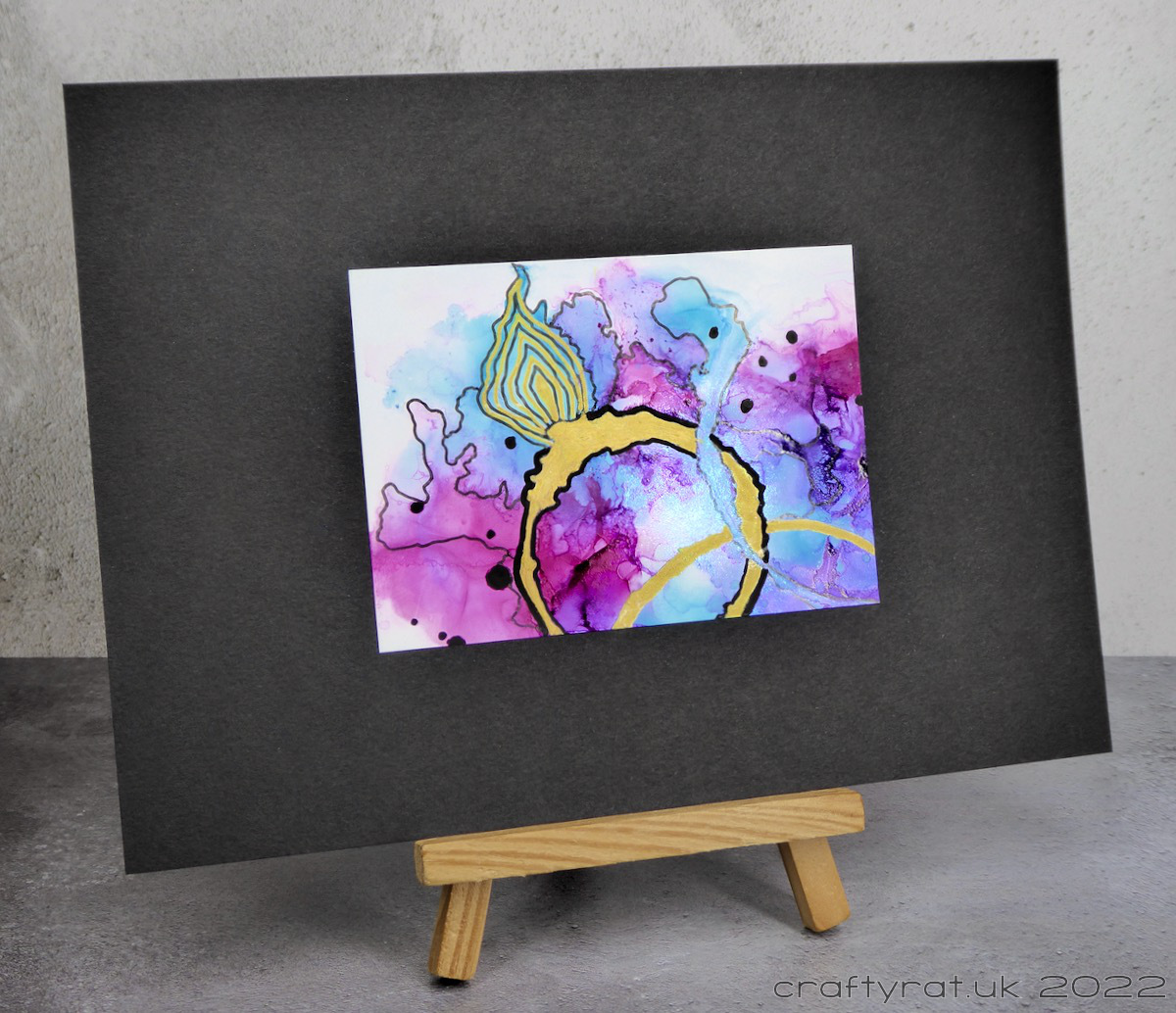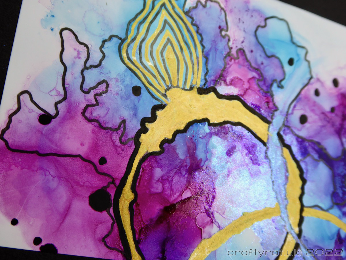 For this one, I started by doodling along some of the edges created where the alcohol inks met and spread. In the process I saw what looked like a flame, or a rough-cut gem, on the main circle and decided to highlight that. I added a heavier outline to the ring, coloured it with gold, and then drew alternating gold and black lines inside the flame gem. I finished it by adding a scattering of black dots across the background.