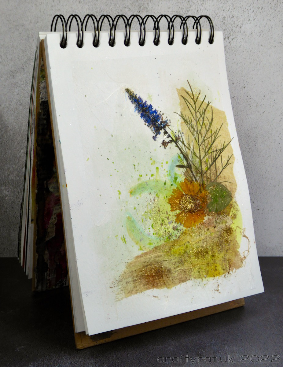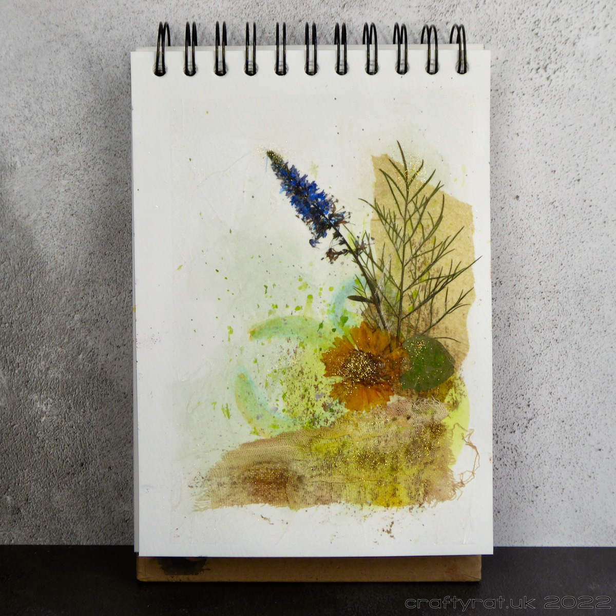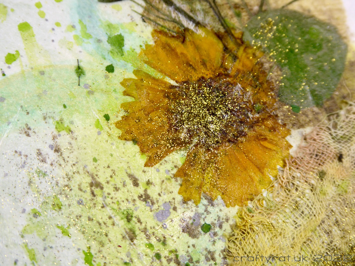 I started with a few brushstrokes in the background, then a piece of collage paper, followed by the dried pressed flowers and a sprinkle of glitter. All of that was encased with the fine tissue paper, in fact the only thing that wasn’t is the scrap of dyed cheesecloth at the bottom.